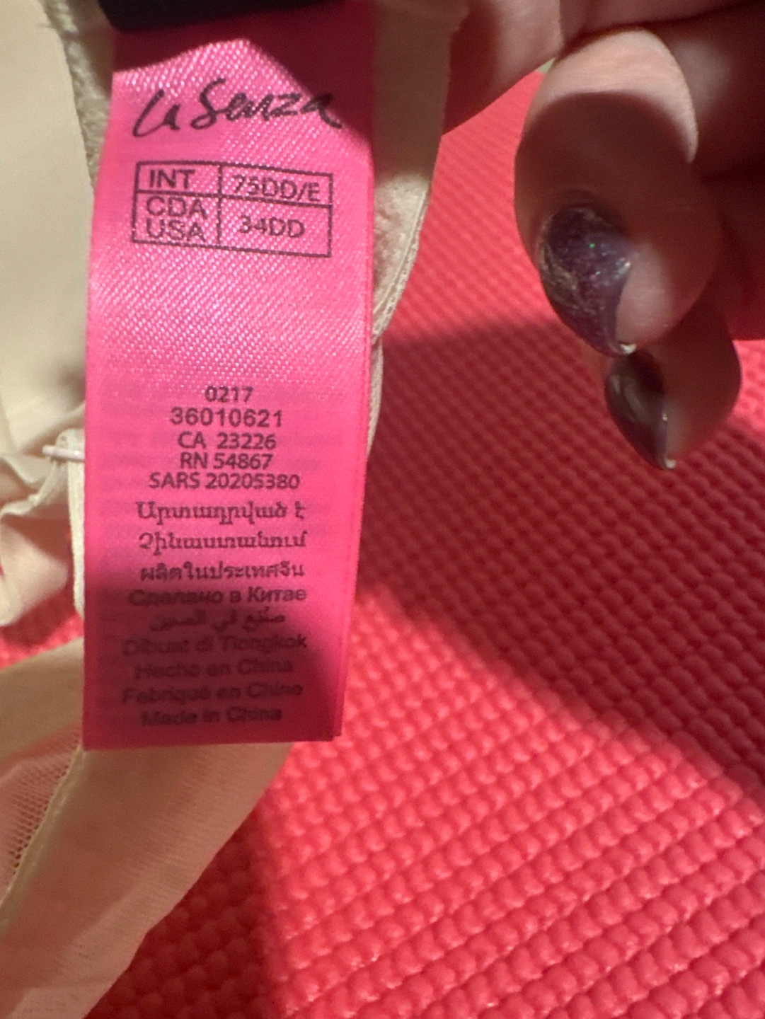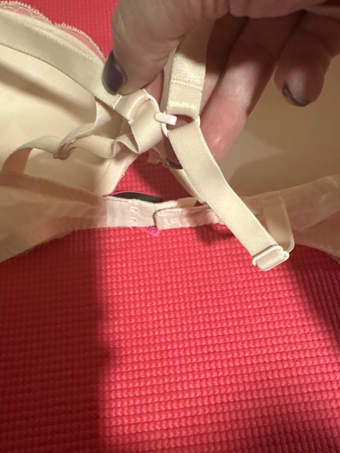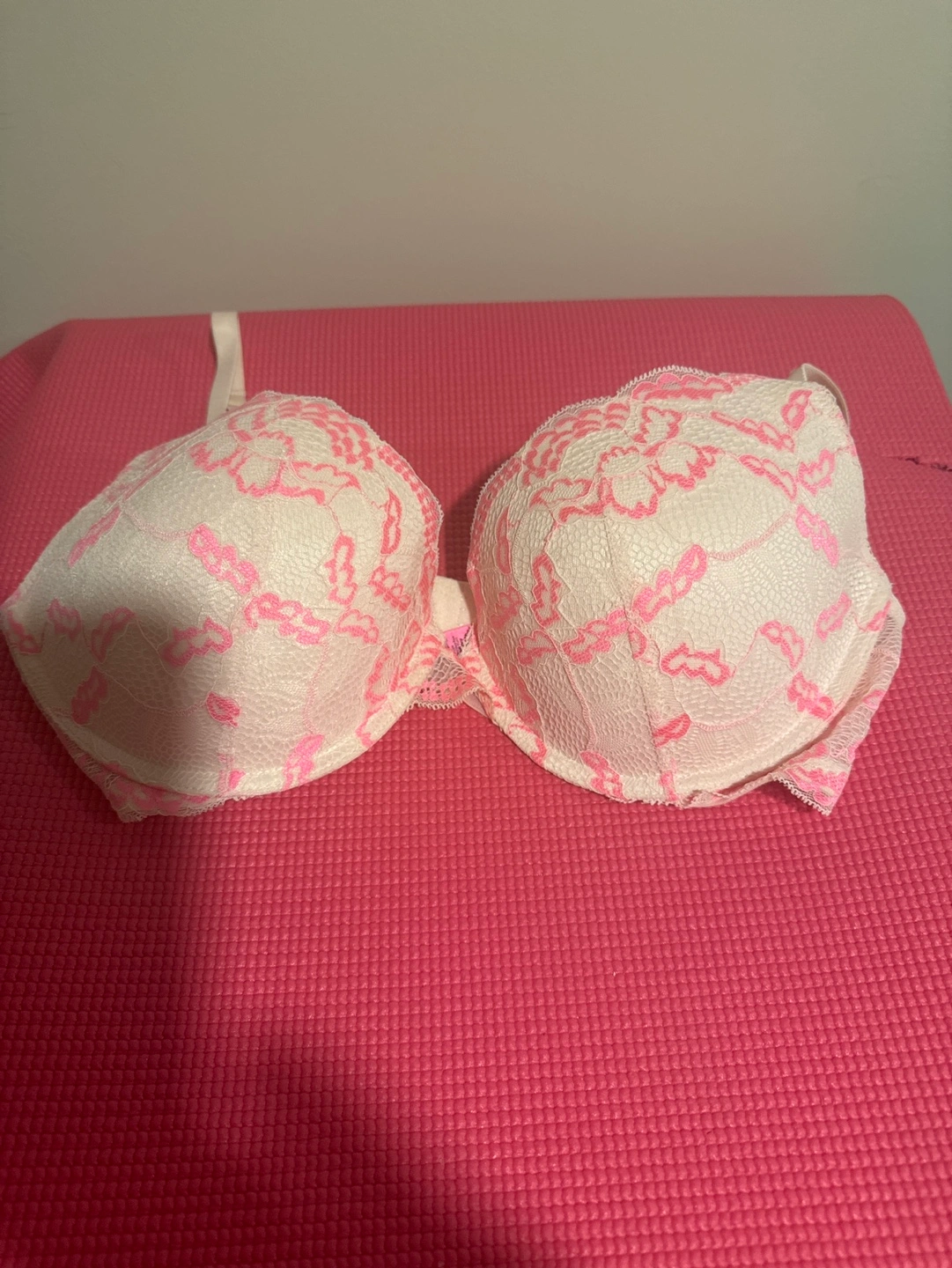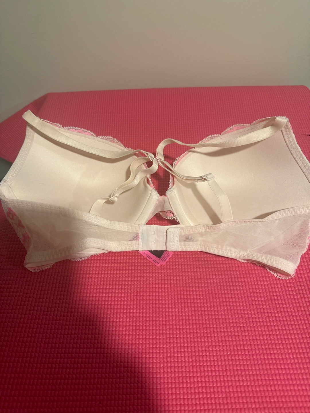 Cream-coloured bra with pink lace detailing. Adjustable straps. Size 34DD. Has u clip so can be worn with razer back tops. Never worn. This is a push up bra with underwire.