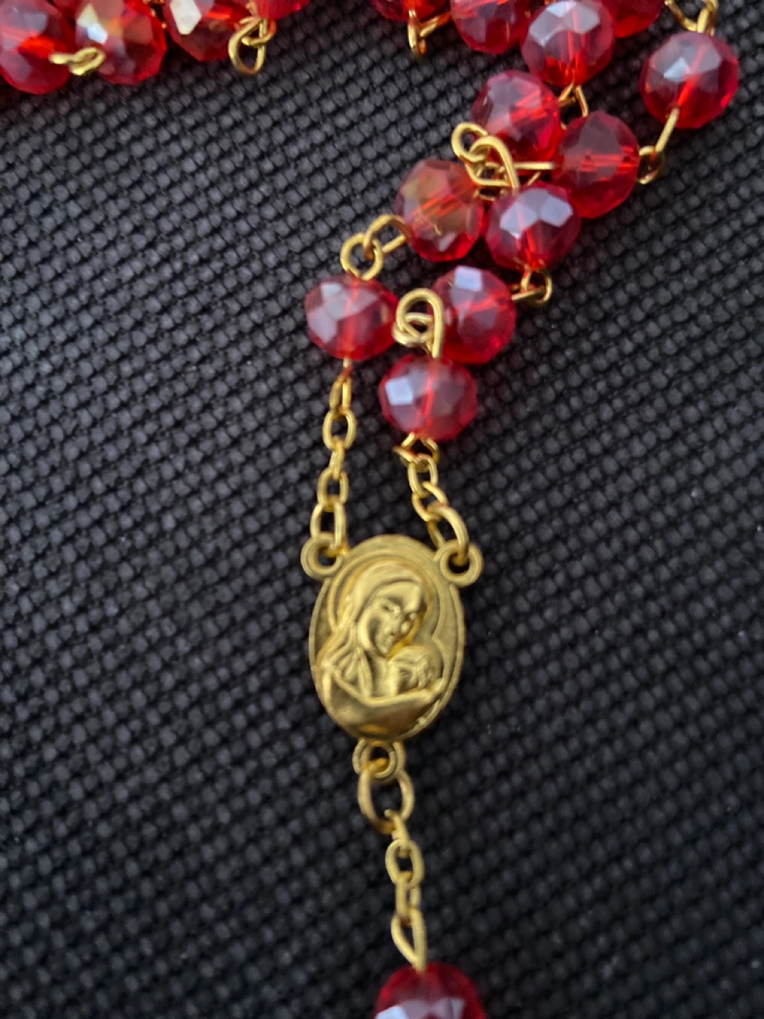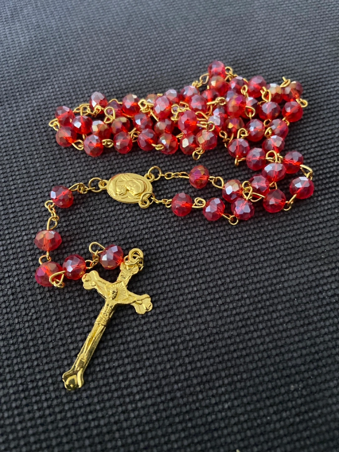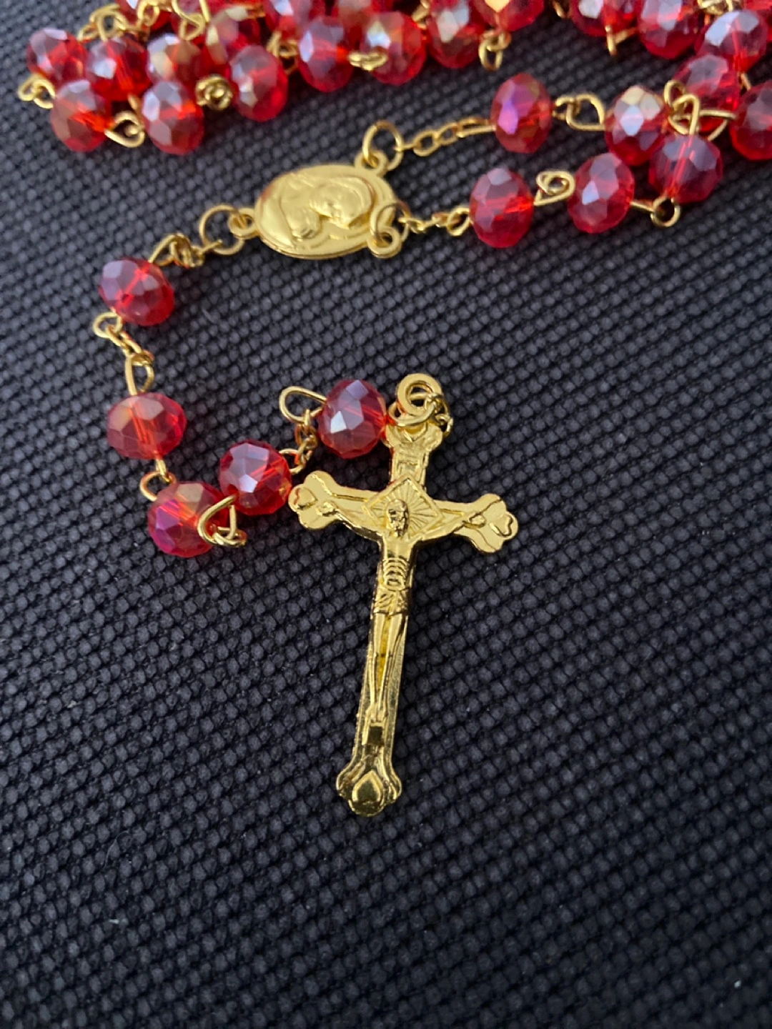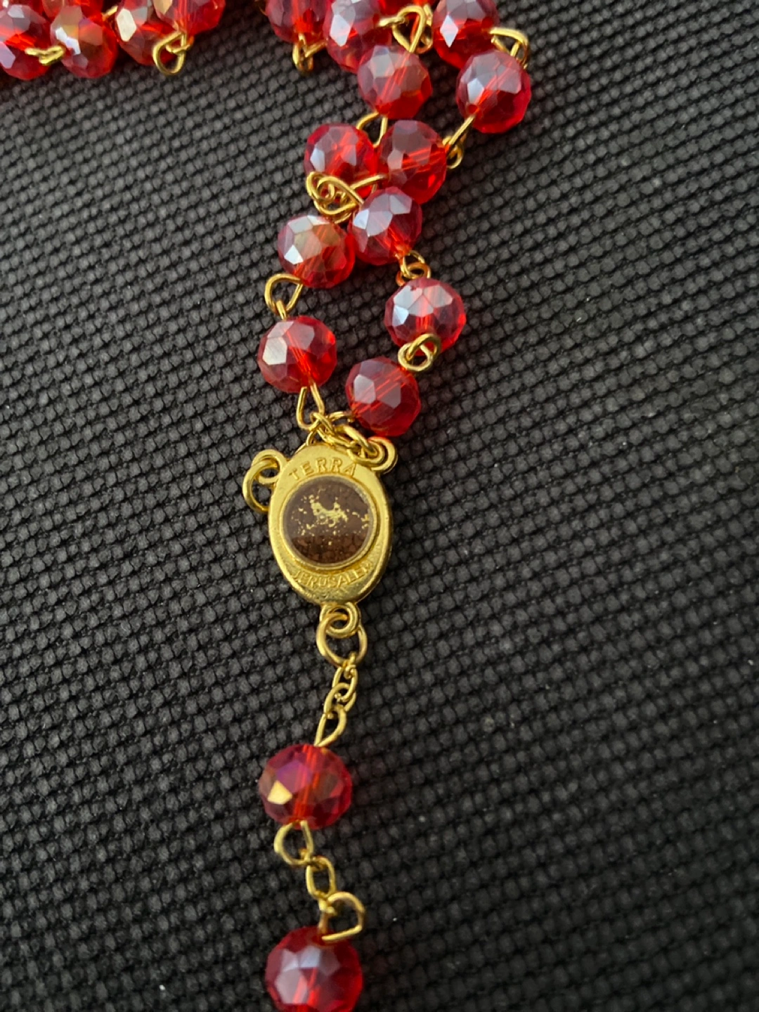Beautiful red crystal rosary beads. Gold-toned crucifix and centerpiece. Features a small Jerusalem emblem.