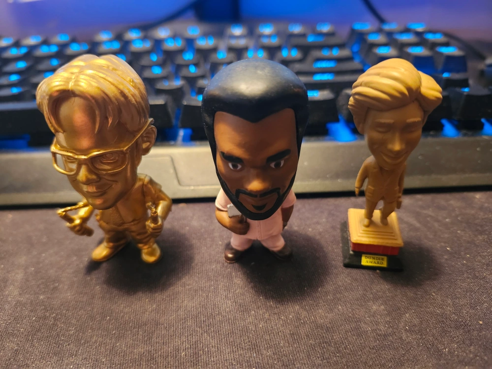 Collection of figurines includes a Skylanders figure, three The Office bobbleheads All pre-owned. Great for collectors.
