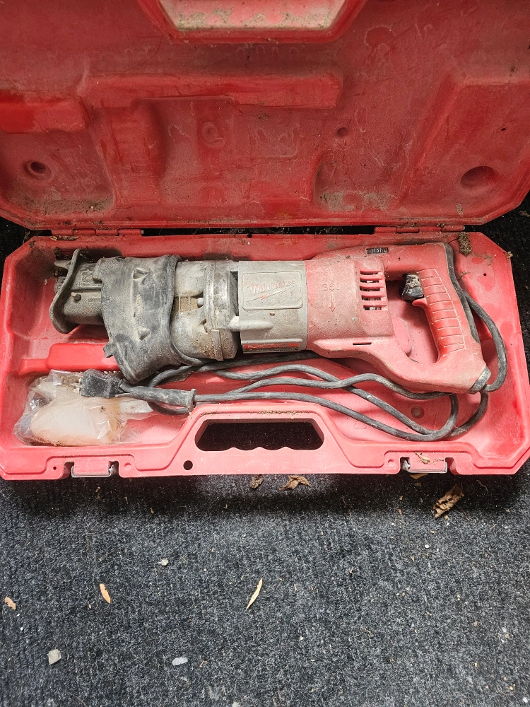Used Milwaukee reciprocating saw. Includes carrying case. Power cord attached. Some wear and tear.