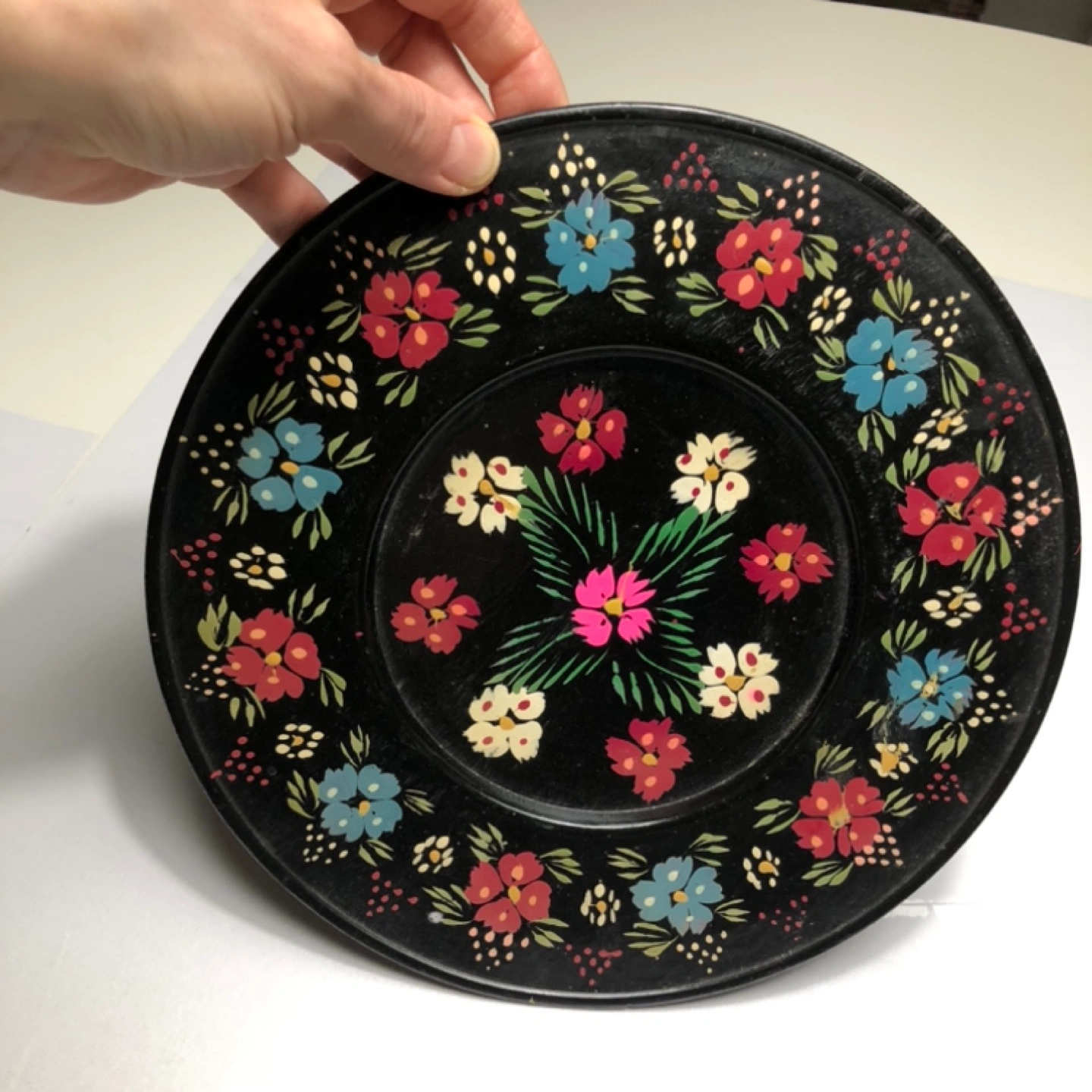 Circular wooden plate. Black background with colourful floral hand-painting in the Ukrainian ethnic Petrykivka style. Measures approximately 23 cm in diameter. Unique vintage hand-painted piece.