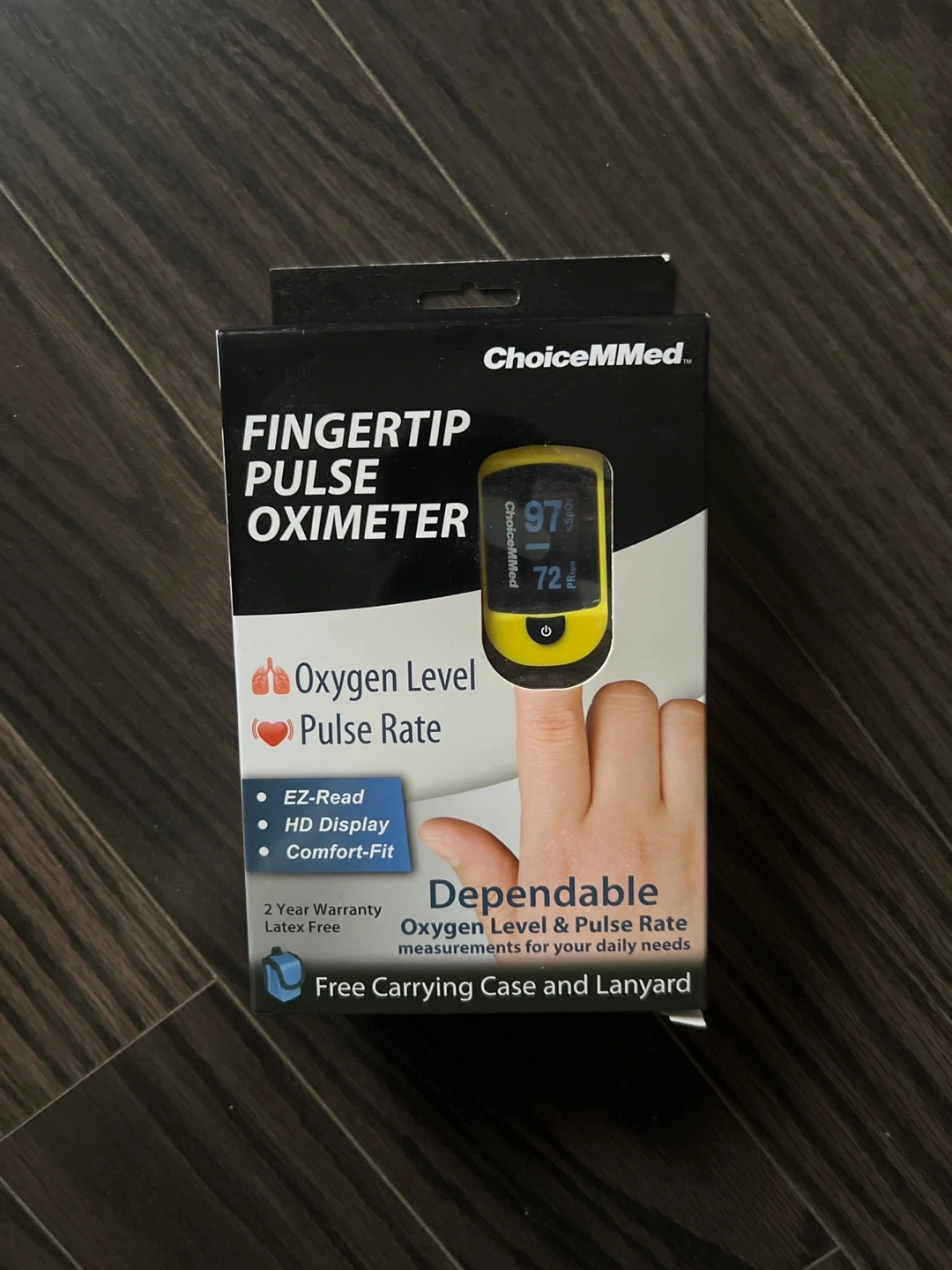 New fingertip pulse oximeter. Measures oxygen level and pulse rate. Features an HD display, comfortable fit, and includes a carrying case and lanyard. Two-year warranty. Latex-free.