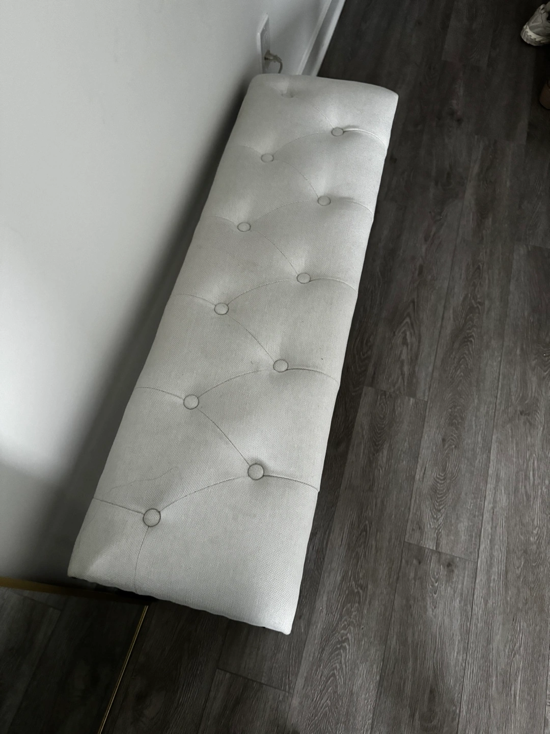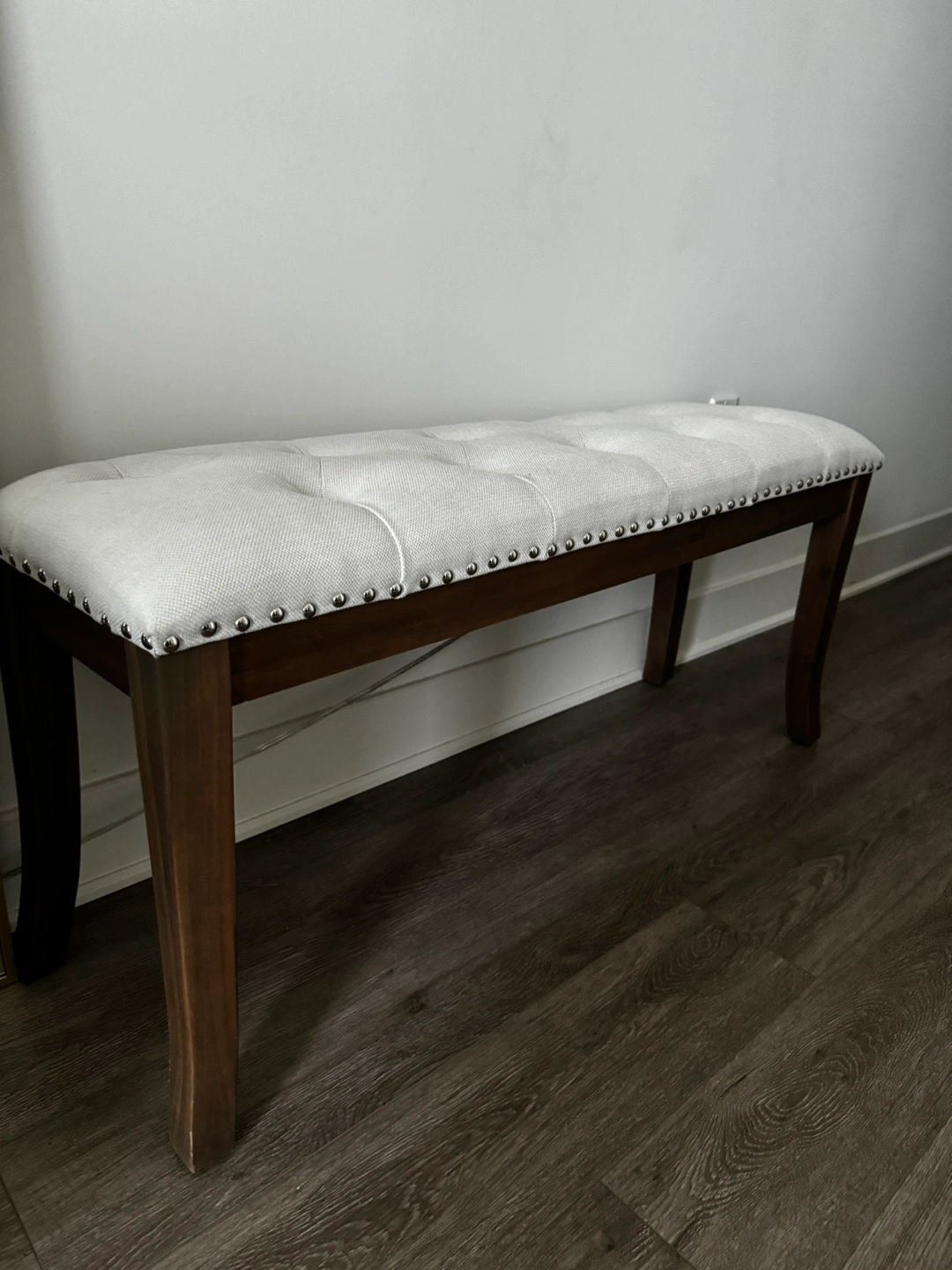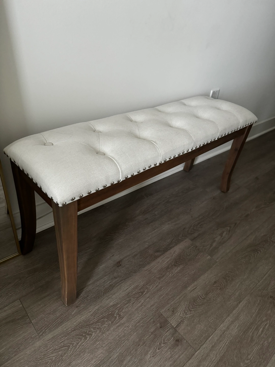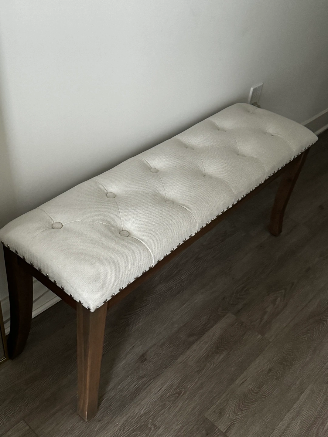 Button tufted bench. Off-white fabric. Dark brown wooden legs. Great for entryway or bedroom. Bought less than 2 months ago from homesense