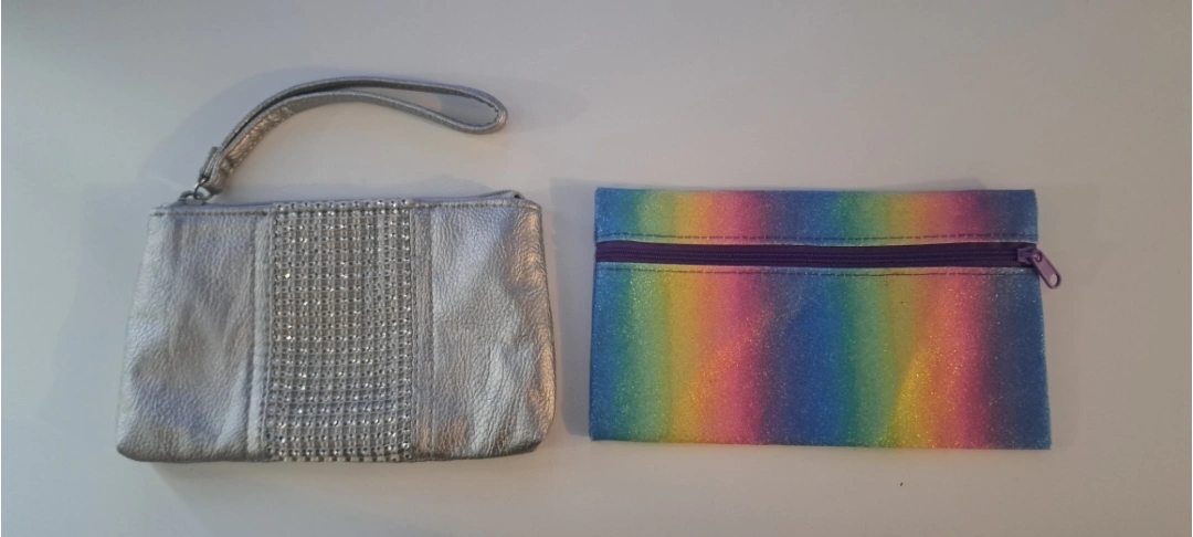 Silver Purse & Rainbow Glitter Pencil Case. Purse is silver with rhinestone accents, top handle. Rainbow glitter, zipper closure pencil case. Perfect for carrying essentials. If interested send me a message. -David