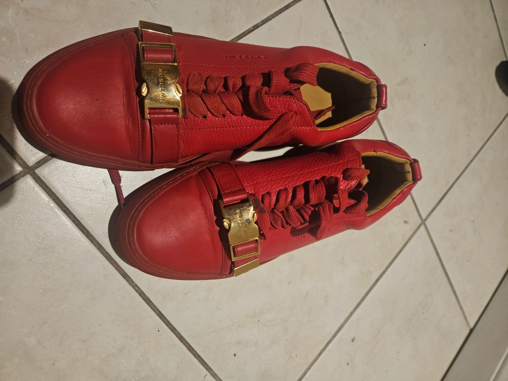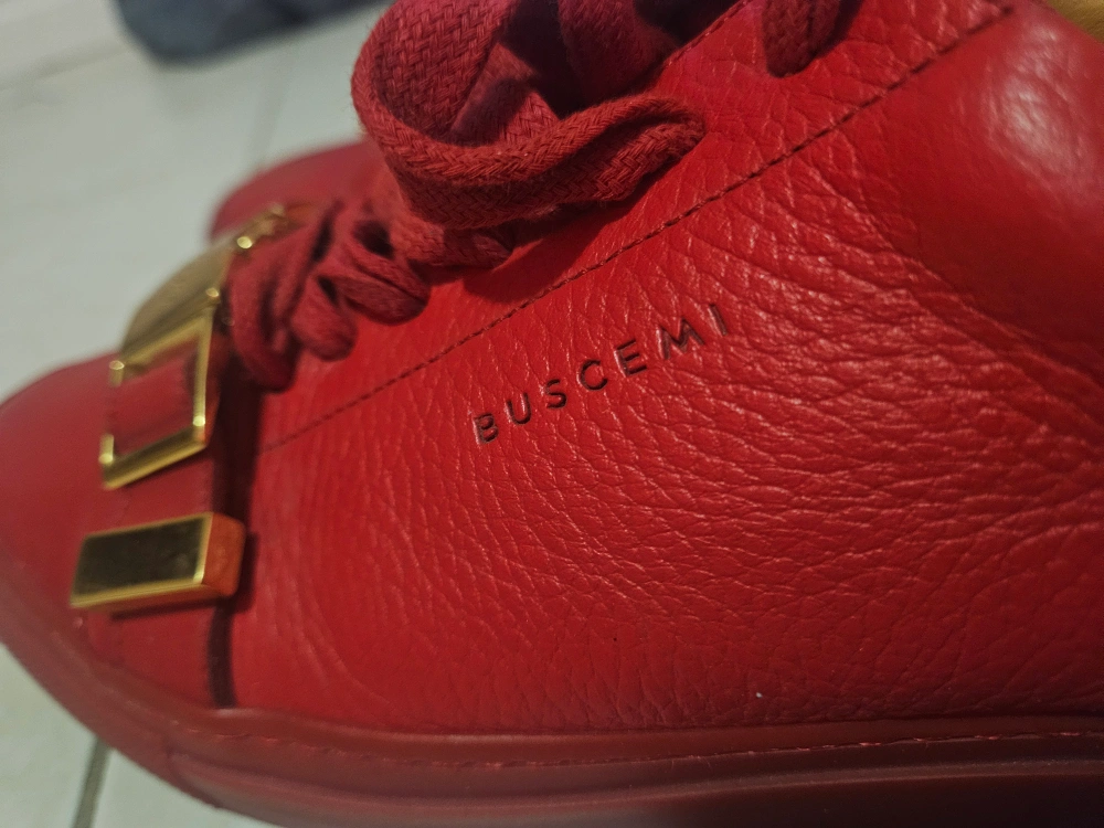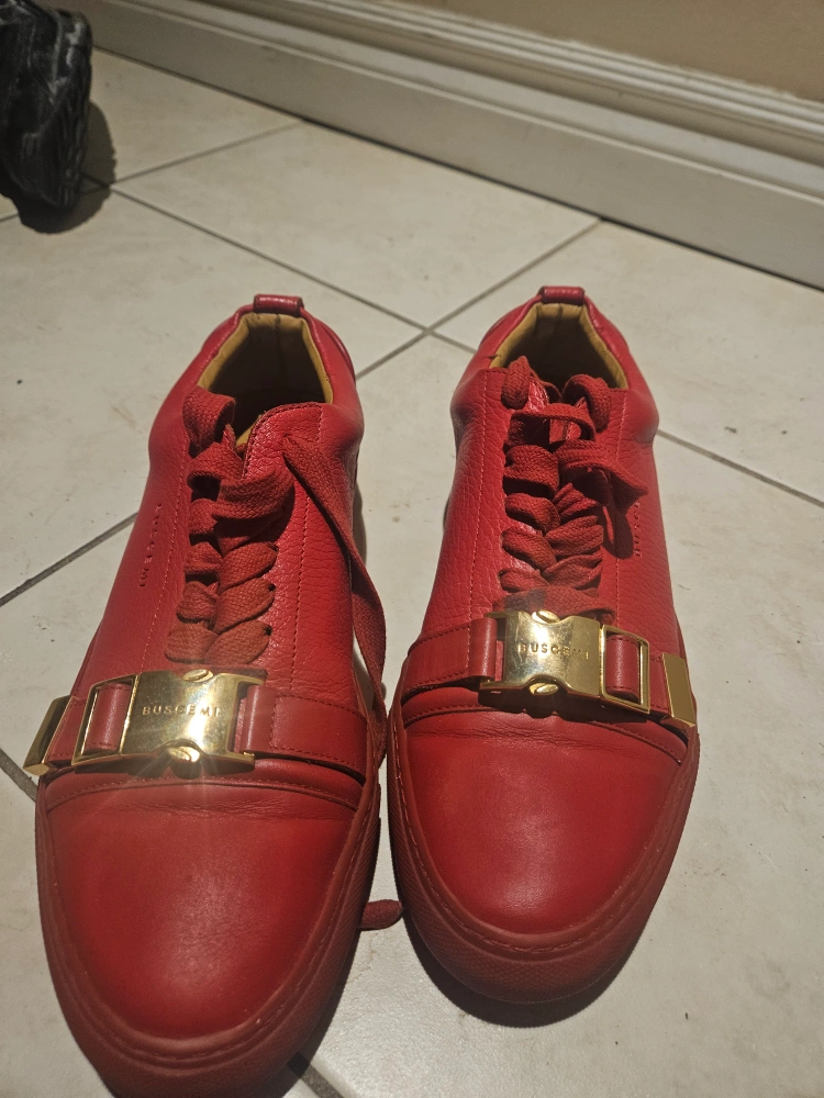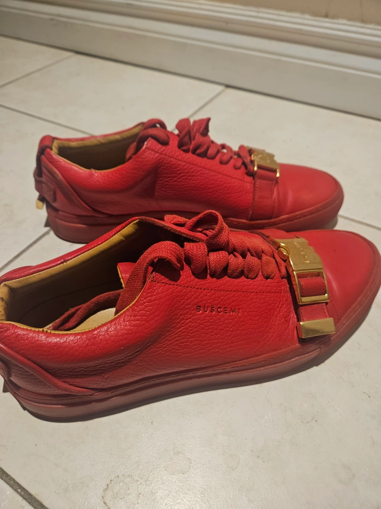 Pre-owned Buscemi sneakers. Red leather upper, gold buckle accents. Lace-up closure. Stylish and eye-catching.