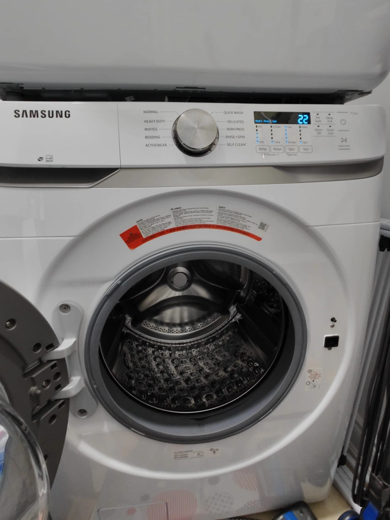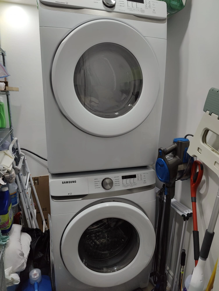 White Samsung washer and dryer. Stackable design. Various wash cycles. Dryer in good condition, washer loud on spin cycle. Model number WF47R6300AW/A5. Serial number 96YSNANAB385E. Washer 5.2 cu.ft Dryer 7.5 cu.ft PRICE FIRM