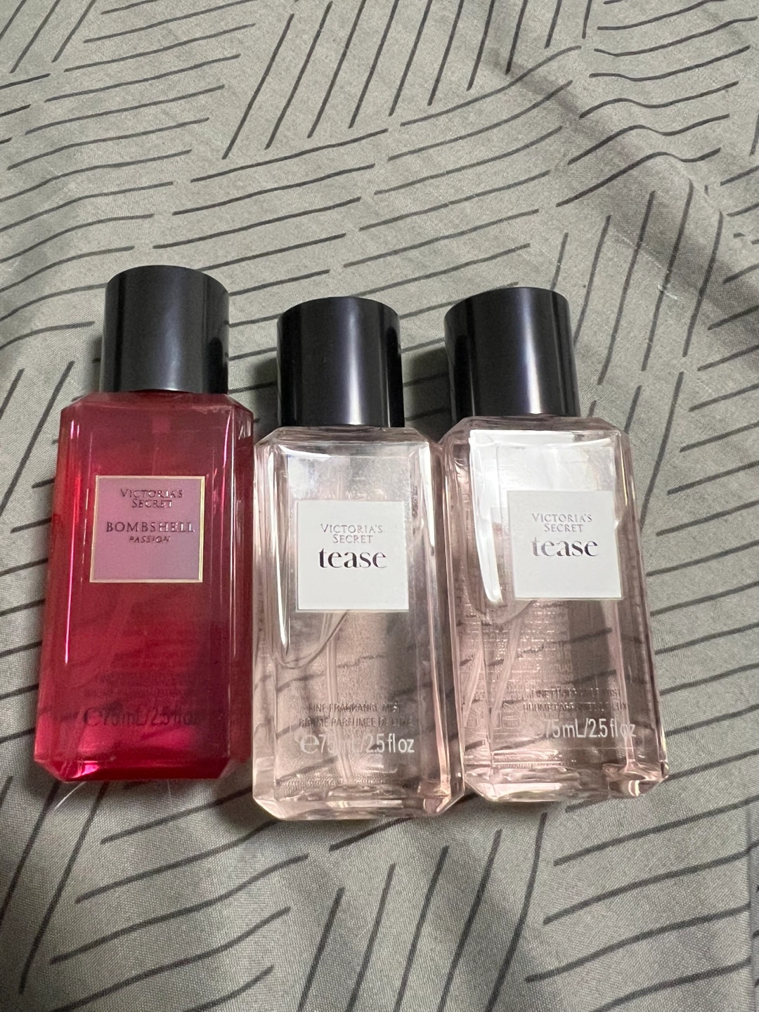 Brand new Three Victoria's Secret fragrance mists. Bombshell Passion, Tease, and Tease. 75ml/2.5 fl oz each. 15 each or all 3 for 40