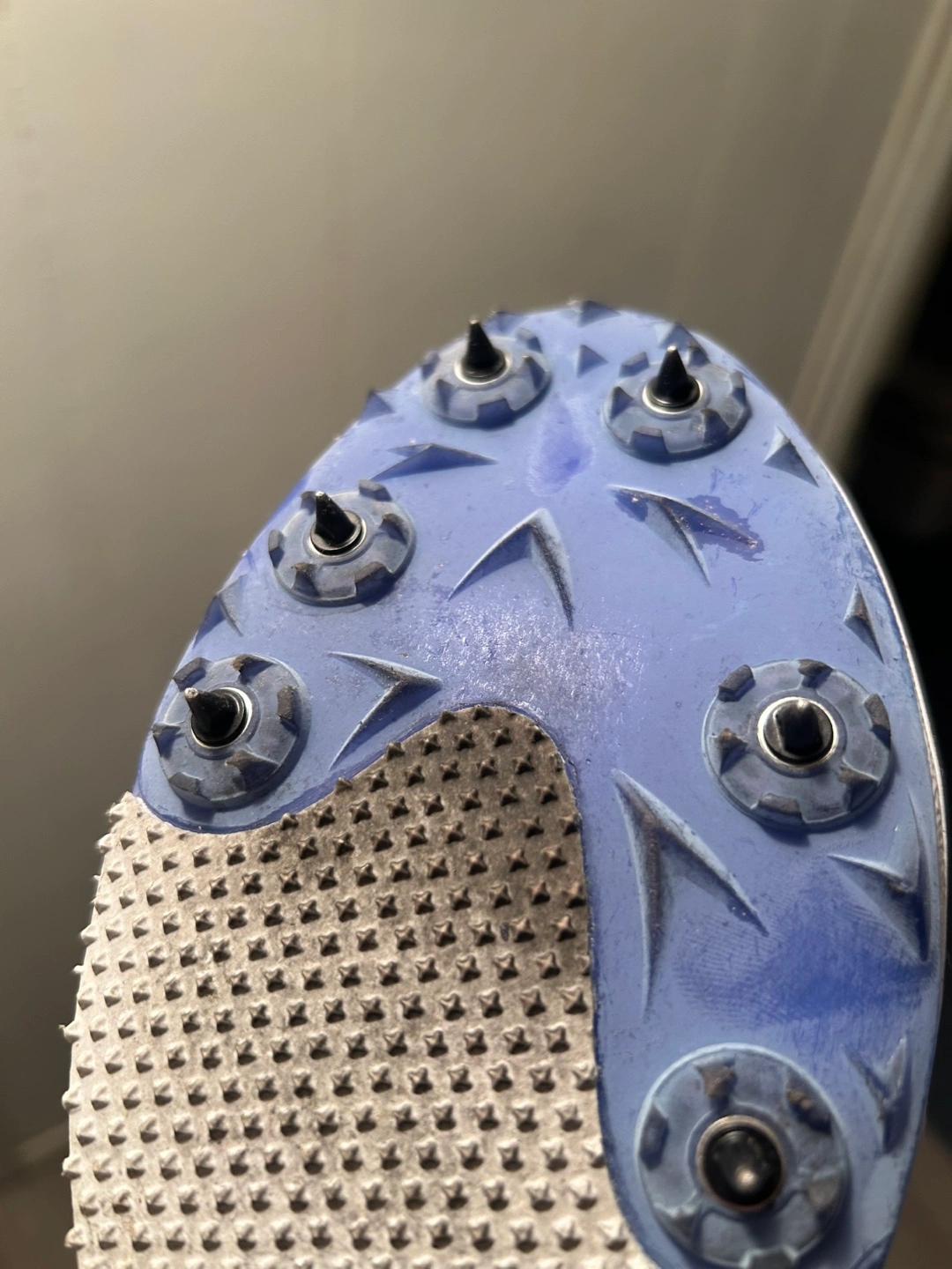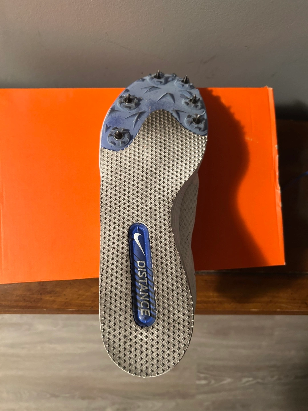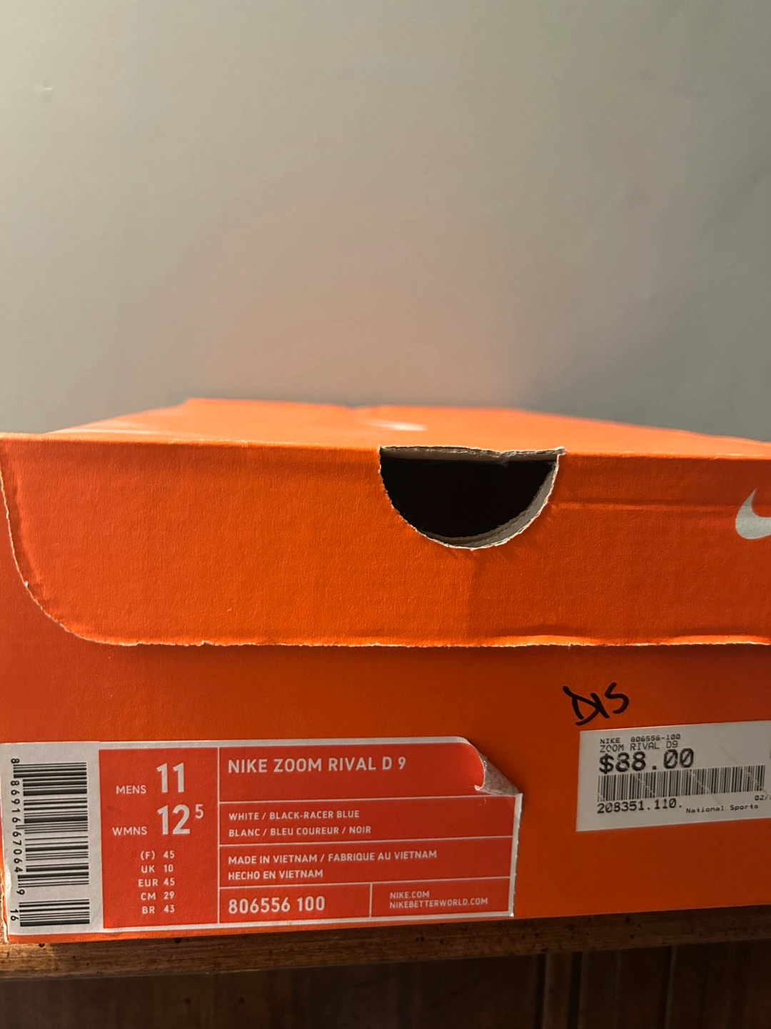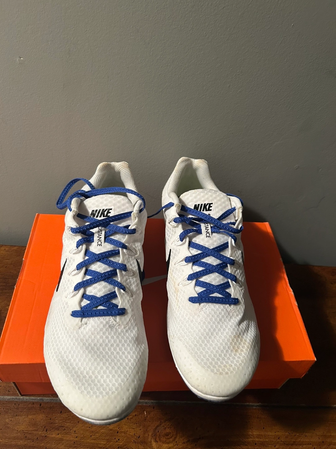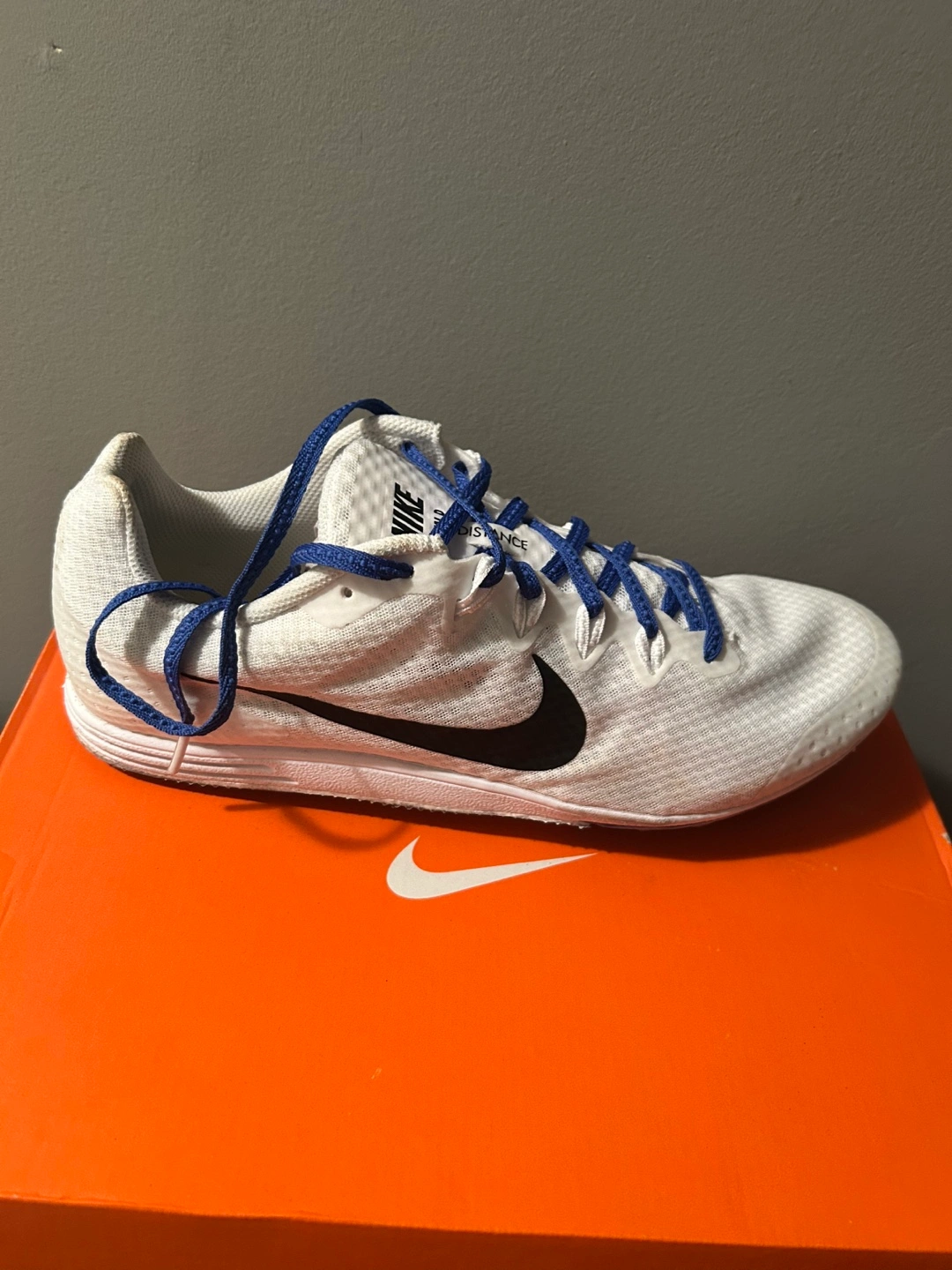 Men's Nike Zoom Rival D 9 track spikes. Size 11. White with blue accents. Excellent for runners. In original box. Does have some stains on the shoe.