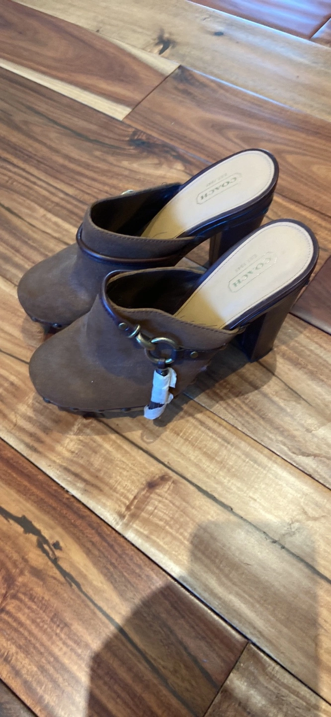 Women's brown suede clogs. High chunky heel. Metal accents. Fringe detail. New no box, priced to sell $40 PU Bolton