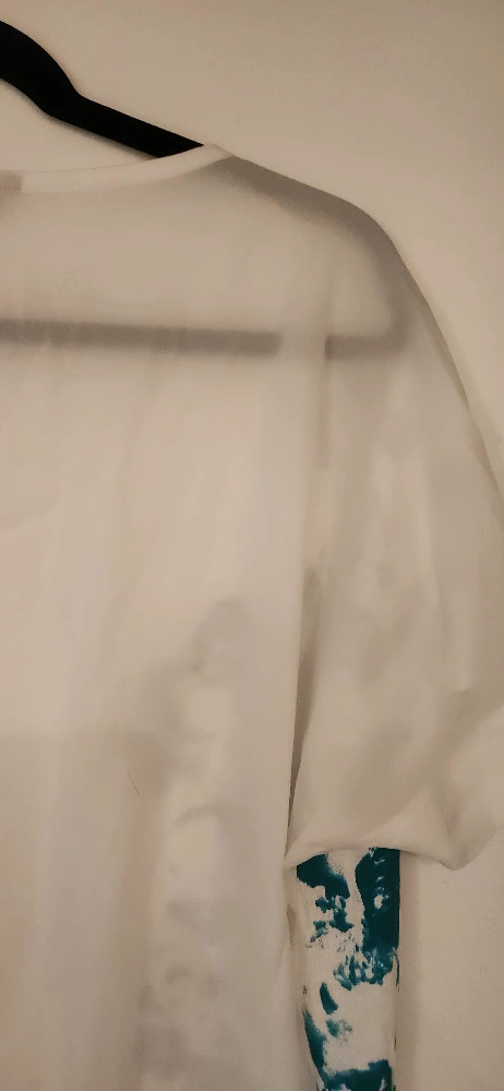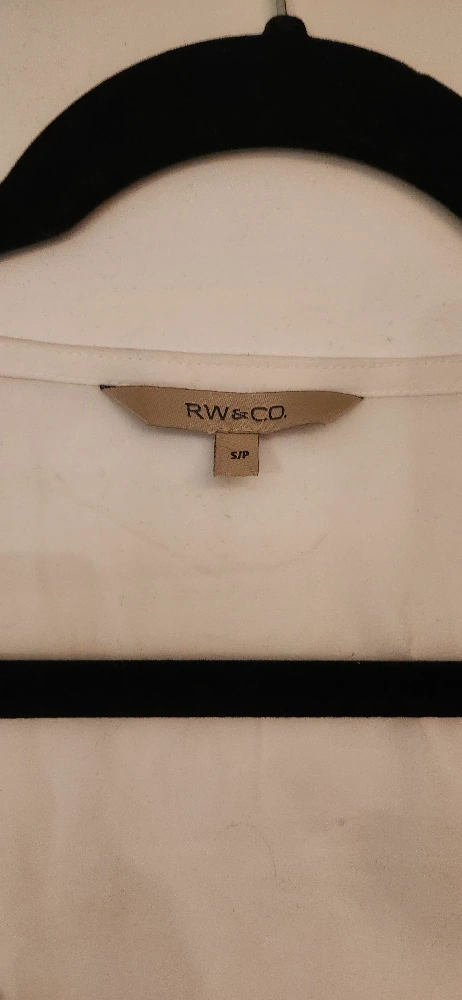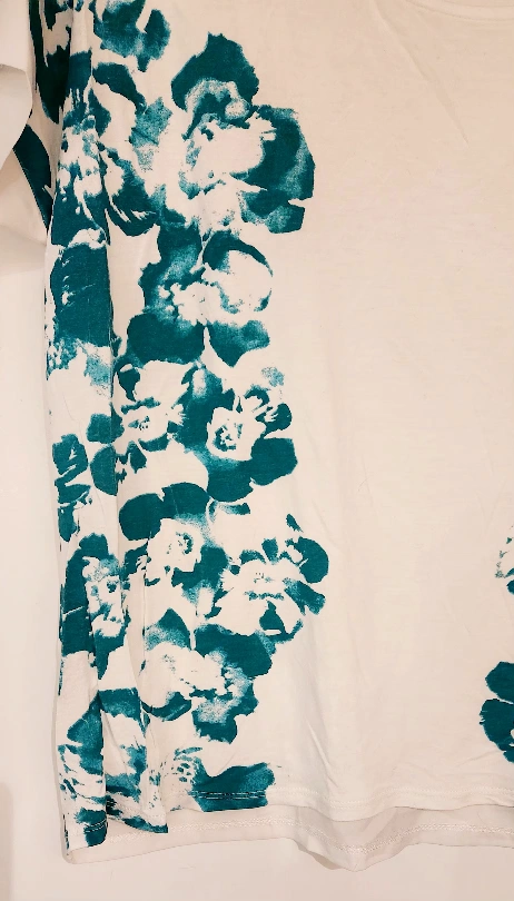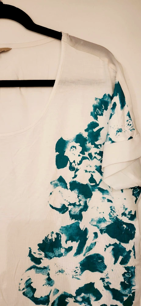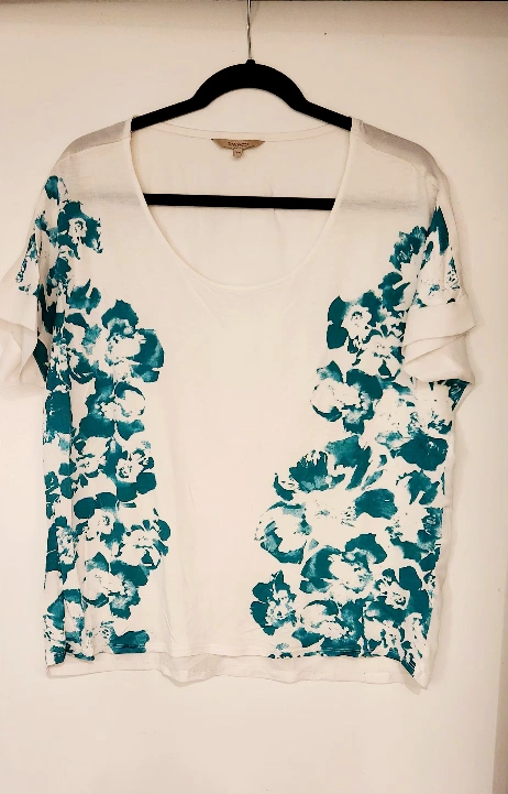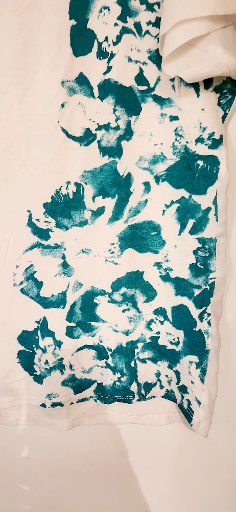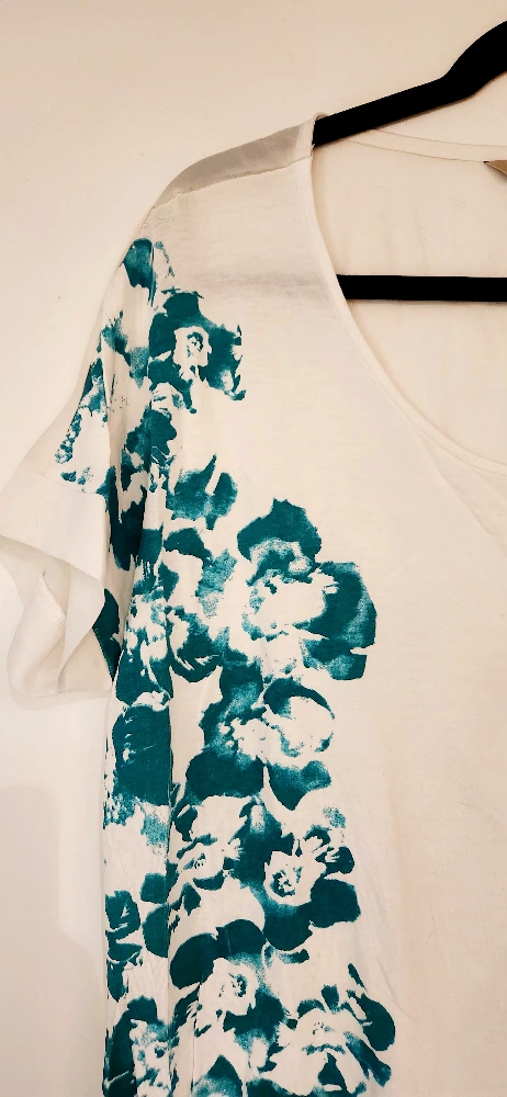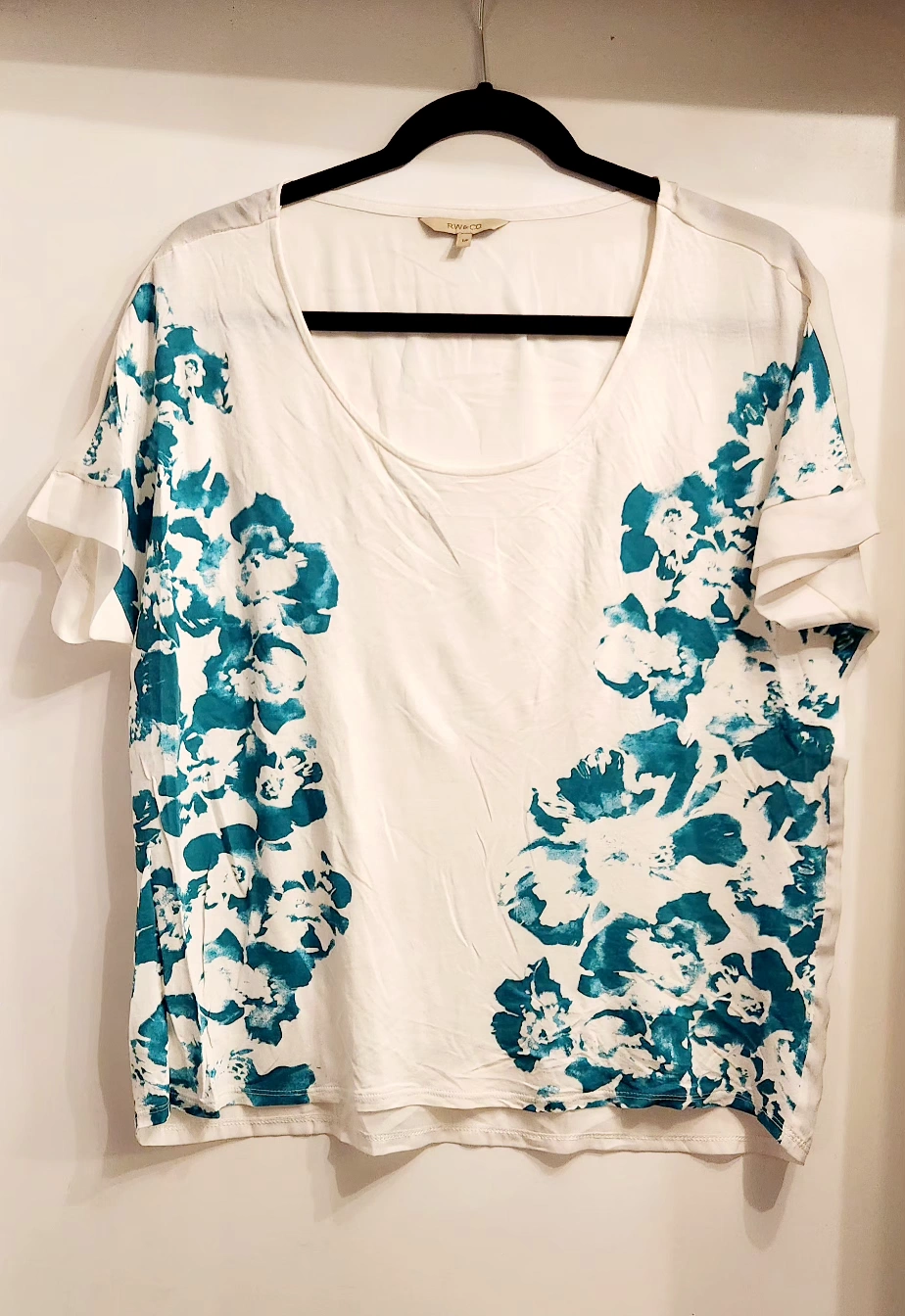 RW&CO short sleeve scooped neck top. White jersey front decorated with emerald green floral print. Back is made of a sheer blouse material. Women's size small but it is a relaxed oversized fit. Excellent used condition.