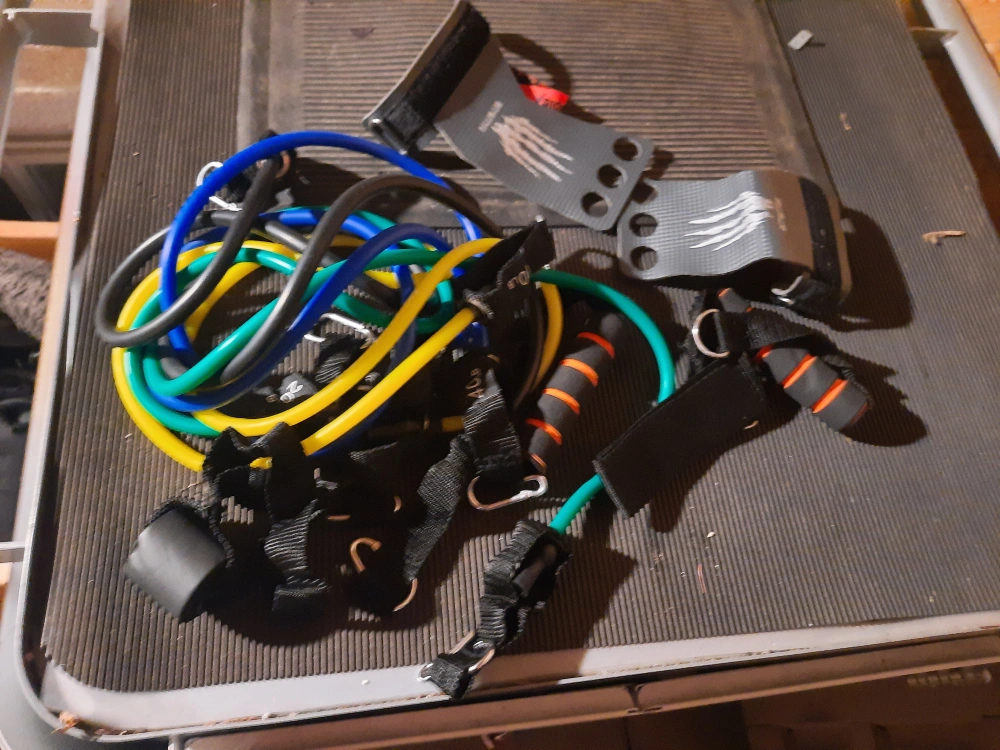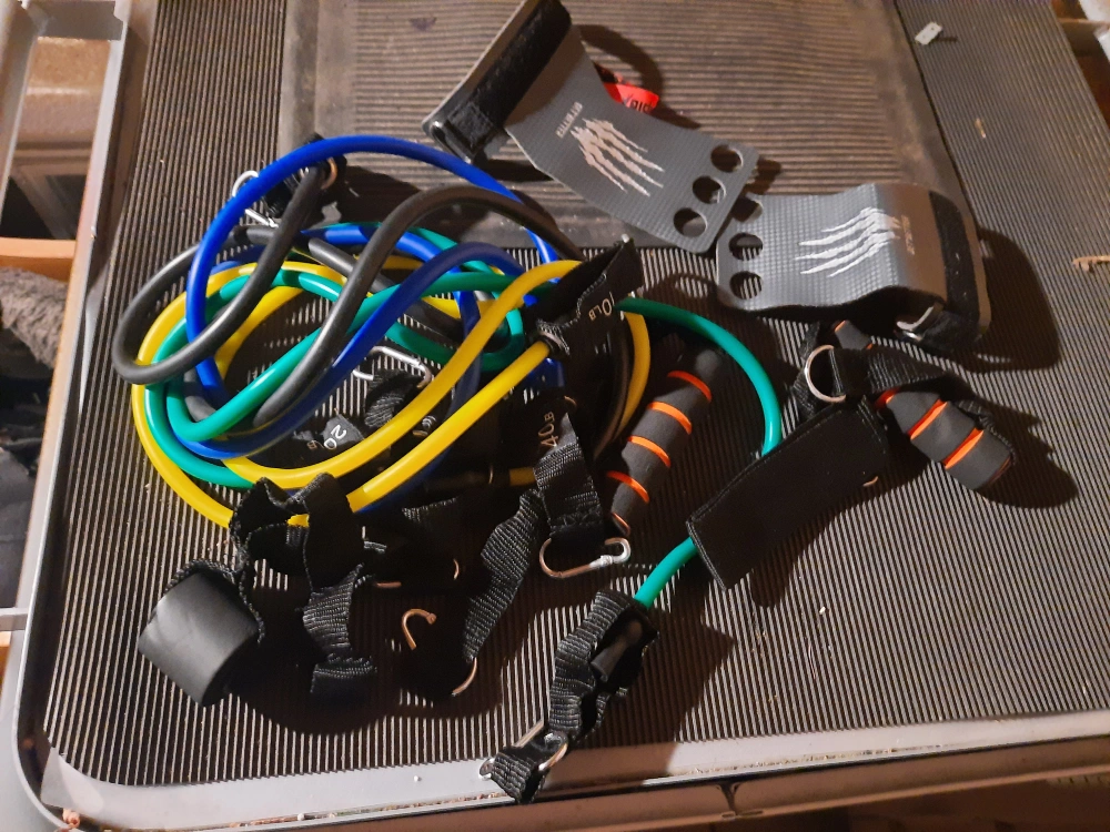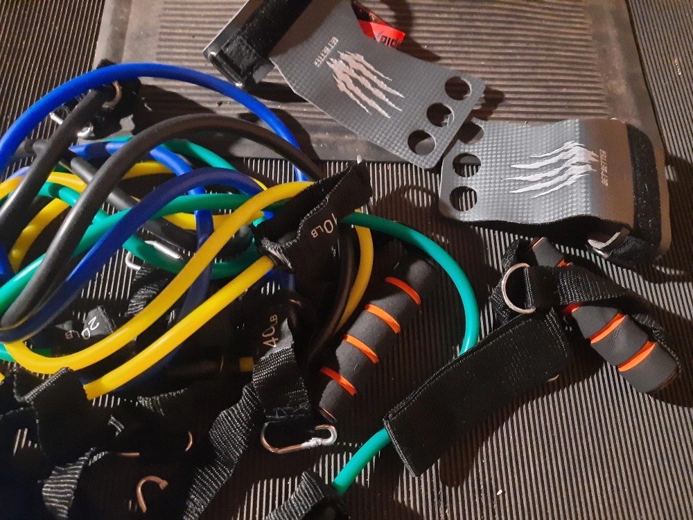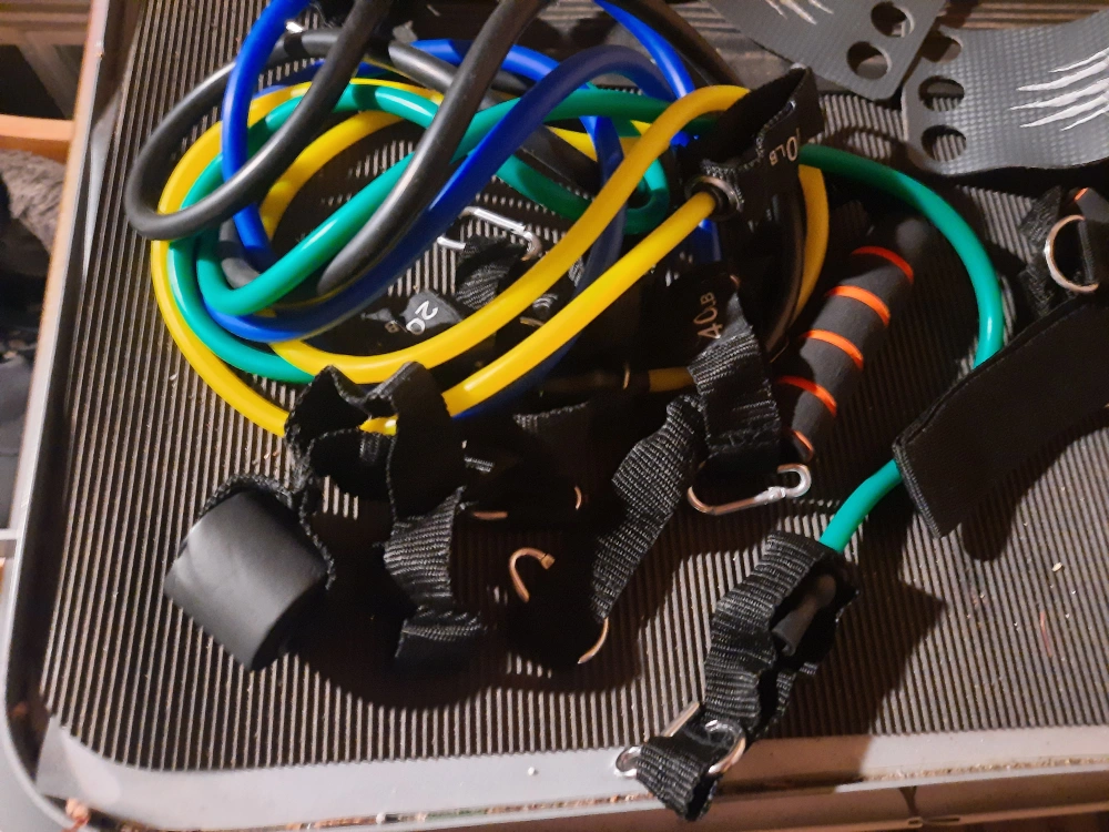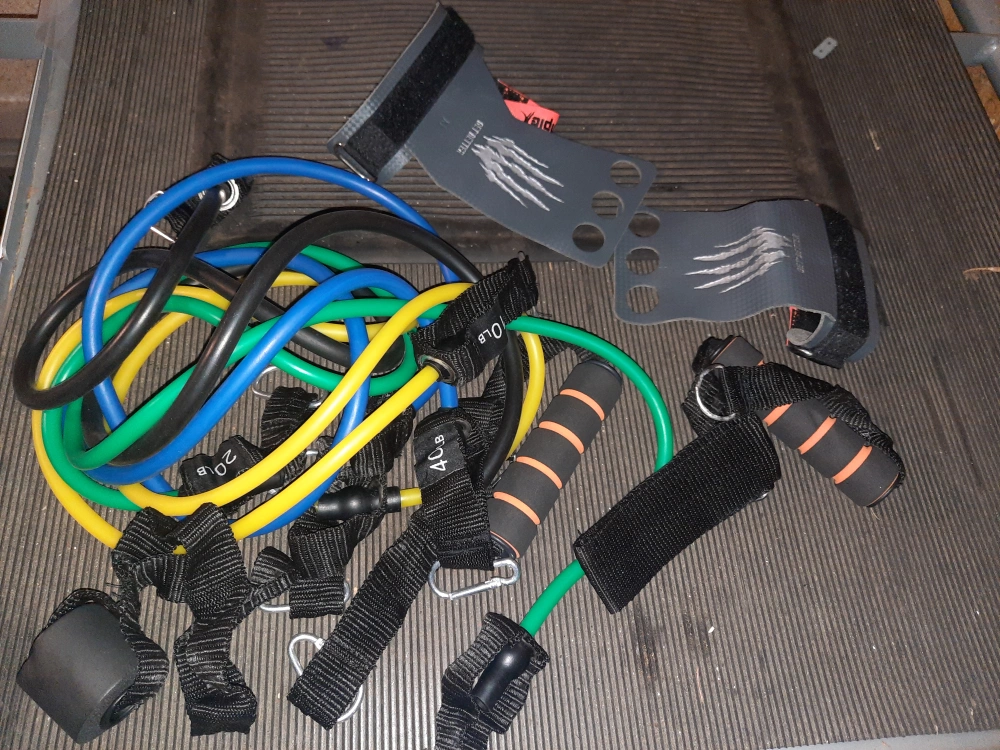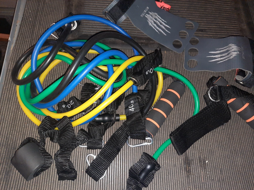 Workout set includes multiple resistance bands, ankle strap, handles, and grip gloves. Great for home workouts. Various resistance levels.