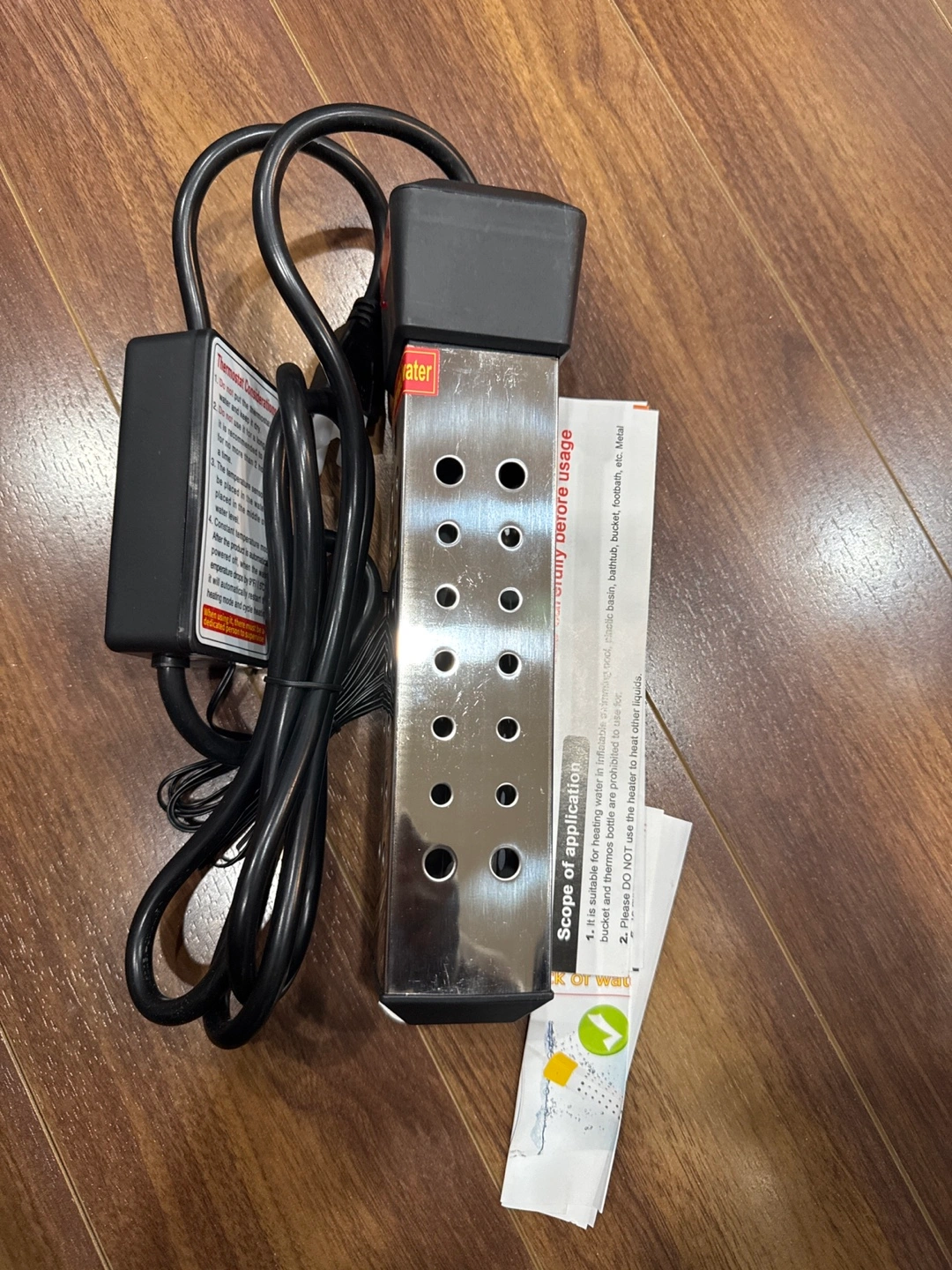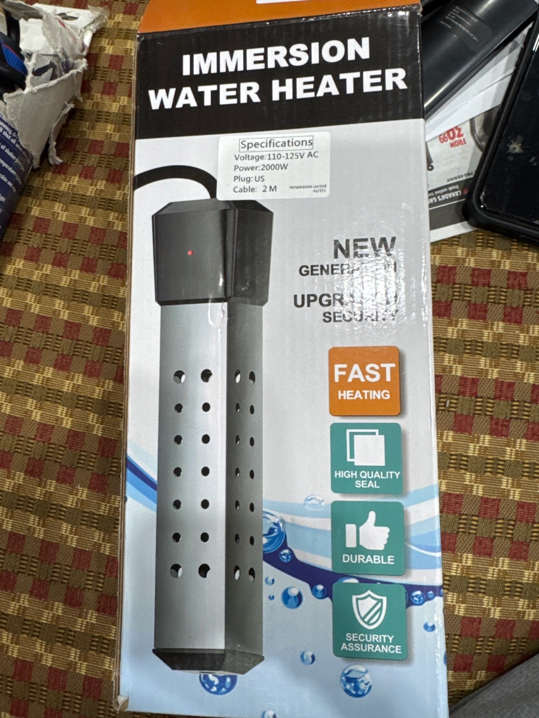 New in box immersion water heater. 2000W, 110-125V AC. 2M cable. Fast heating. High-quality seal. Durable. Security assurance.