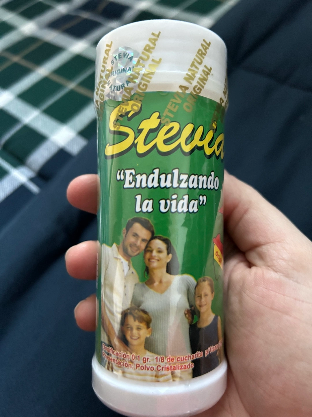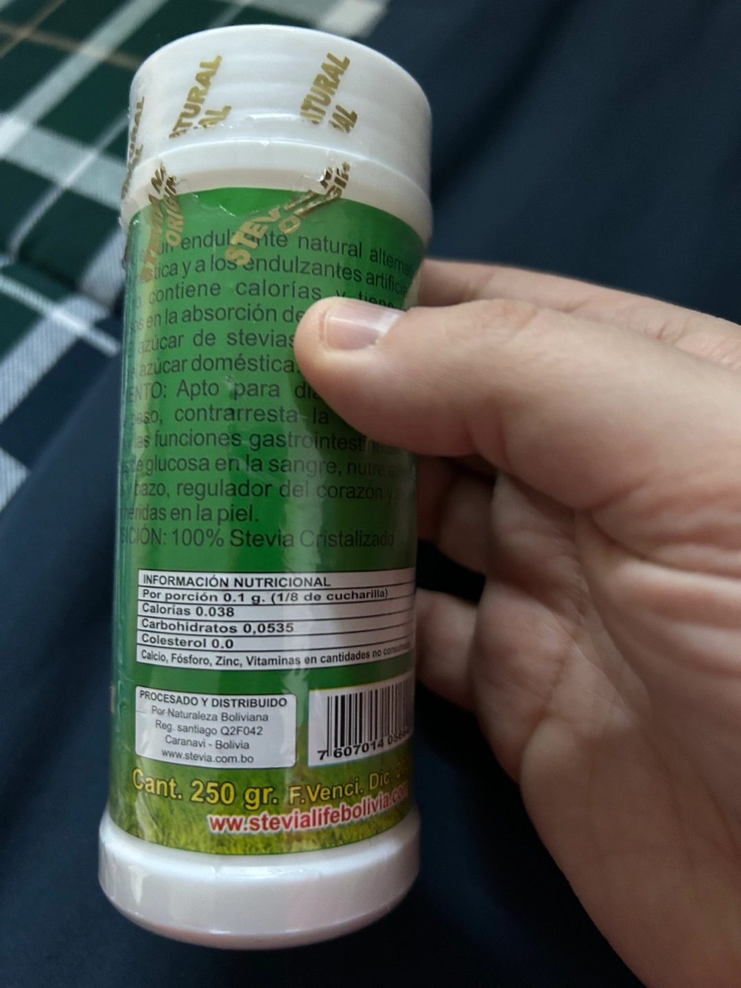 250-gram container of Stevia Natural sweetener. Cristallized powder. Sweetener, zero calories. Made in Bolivia.