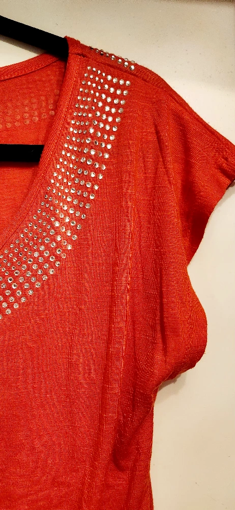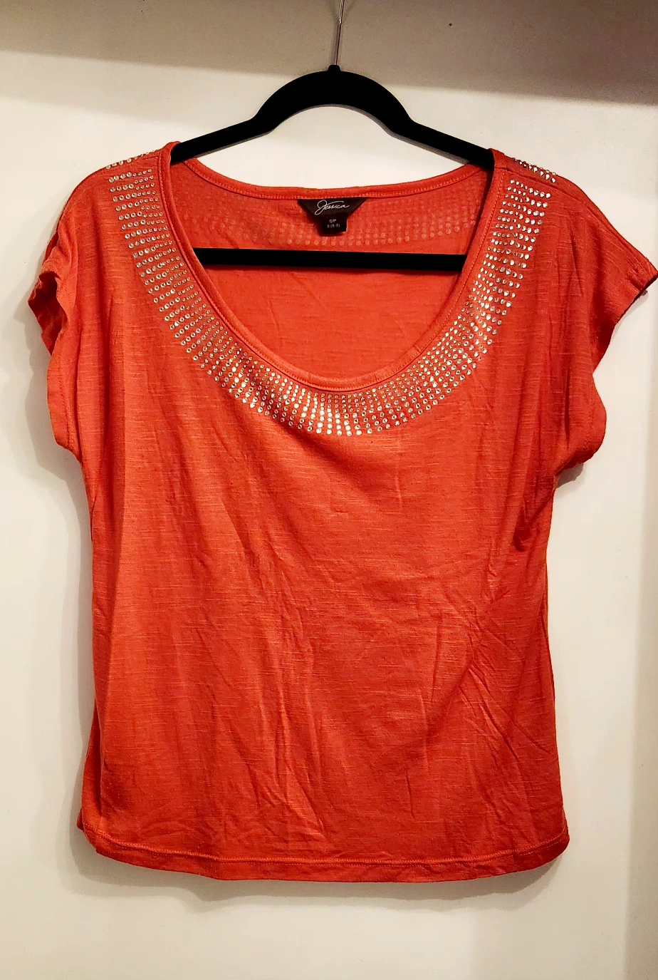 Gorgeous orange scooped neck, short sleeve top. Features a beautiful rounded neckline adorned with rhinestones. Women's size small but is a relaxed oversized fit. Made of a soft jersey knit material. Excellent condition.