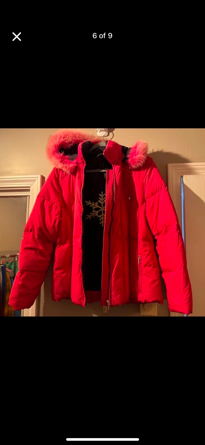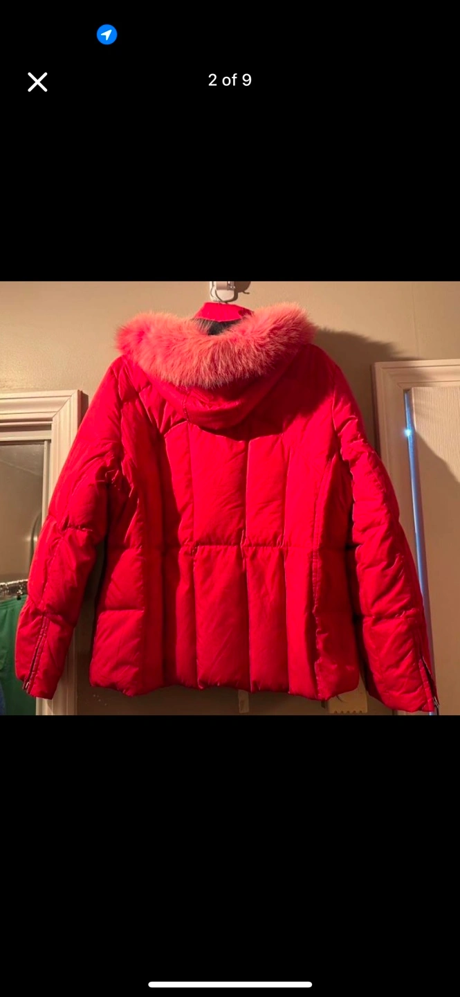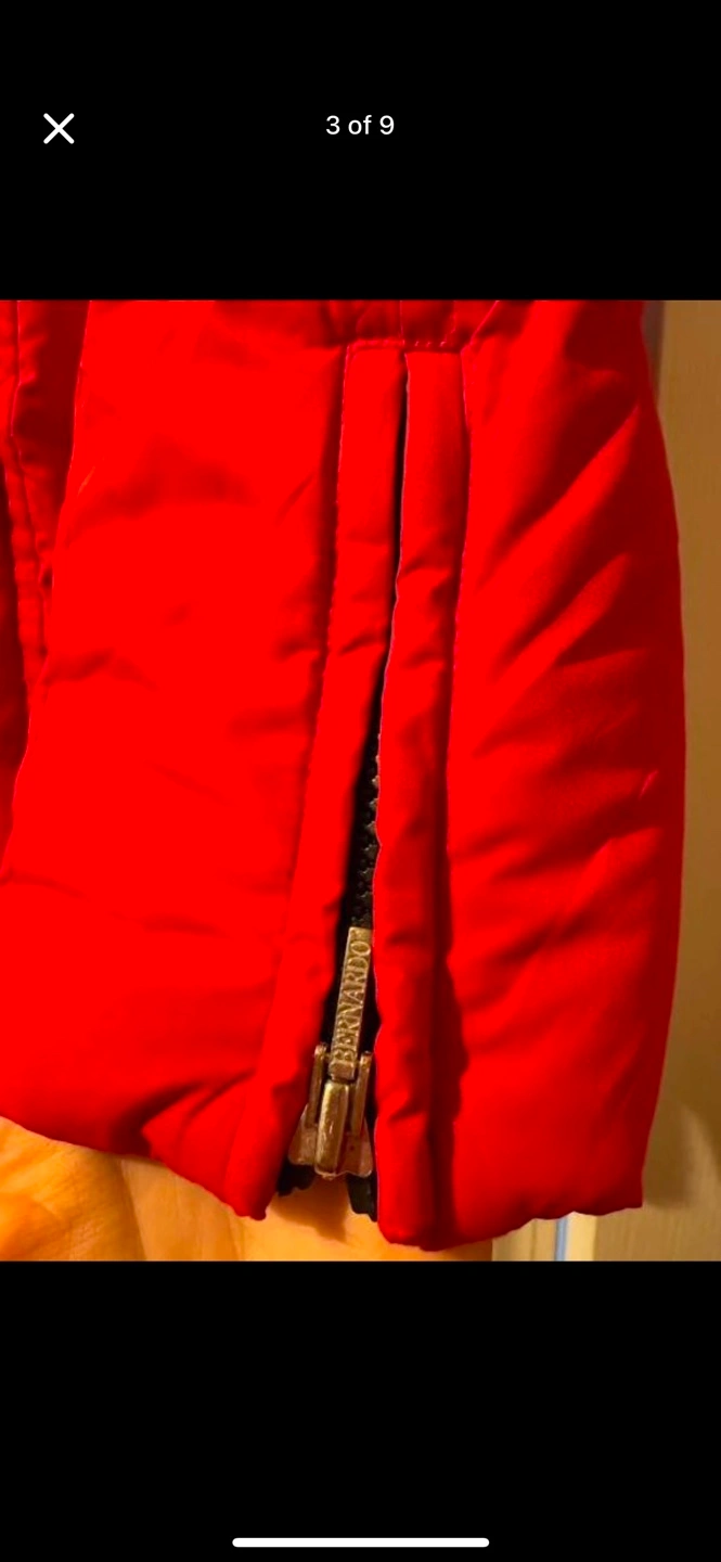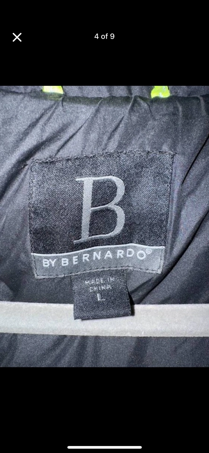 b by bernardo size large down jacket with detachable fur trimmed hood zipper pull missing from one sleeve, please see photo.