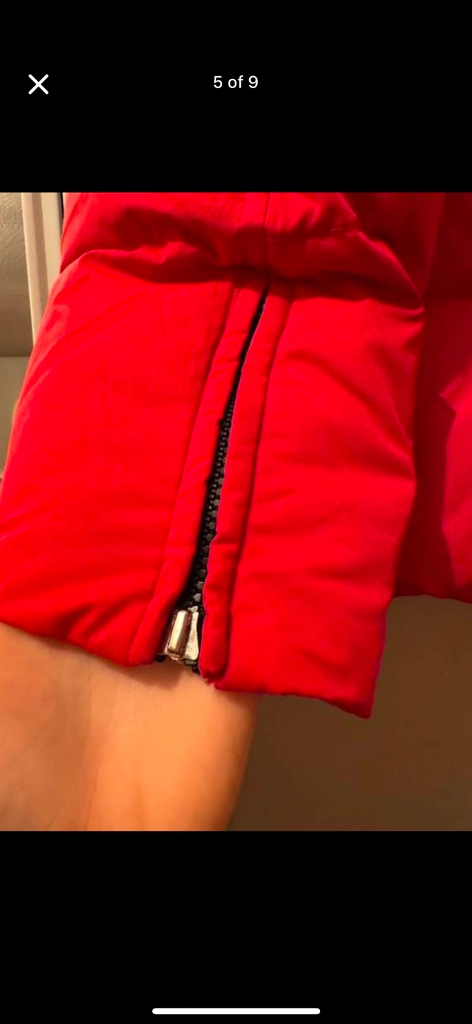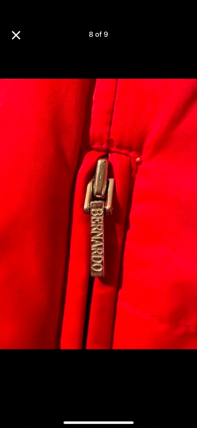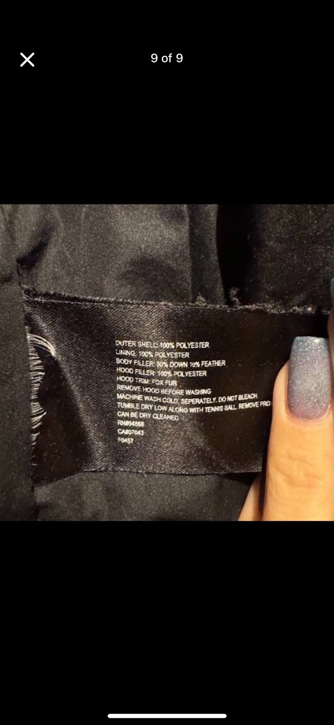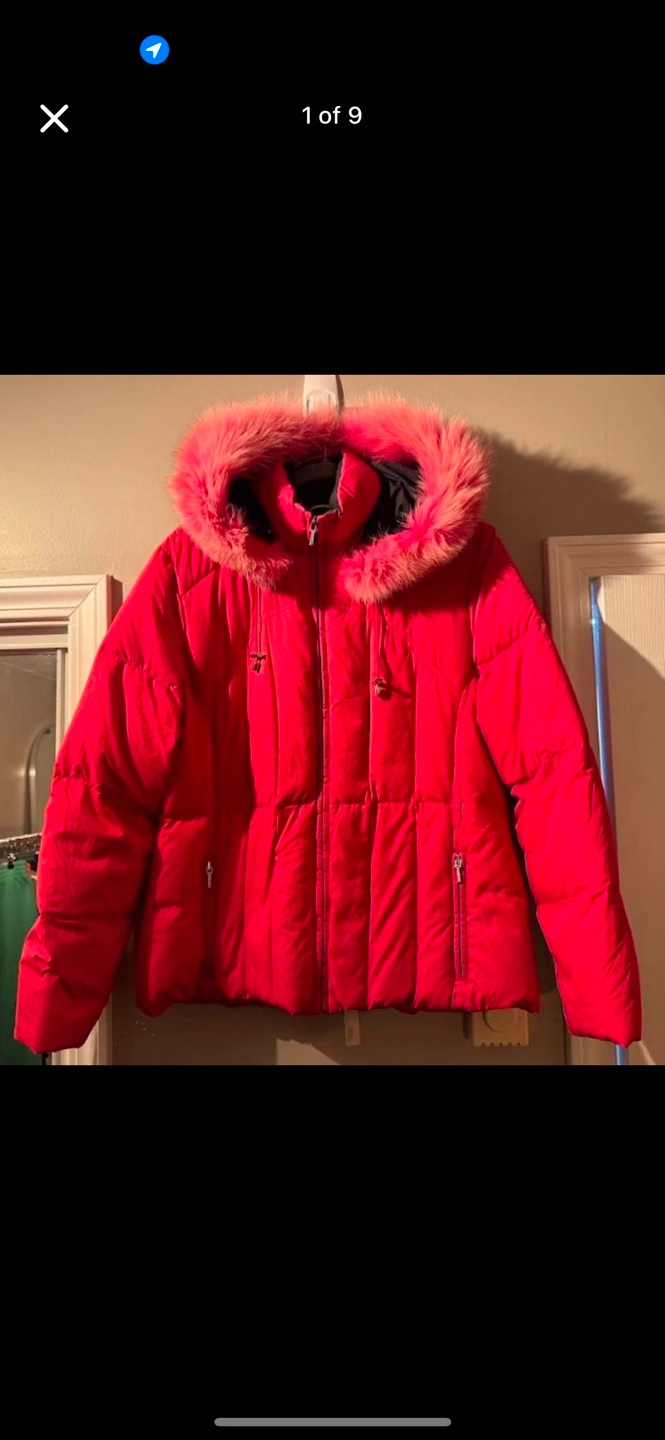 b by bernardo size large down jacket with detachable fur trimmed hood zipper pull missing from one sleeve, please see photo.
