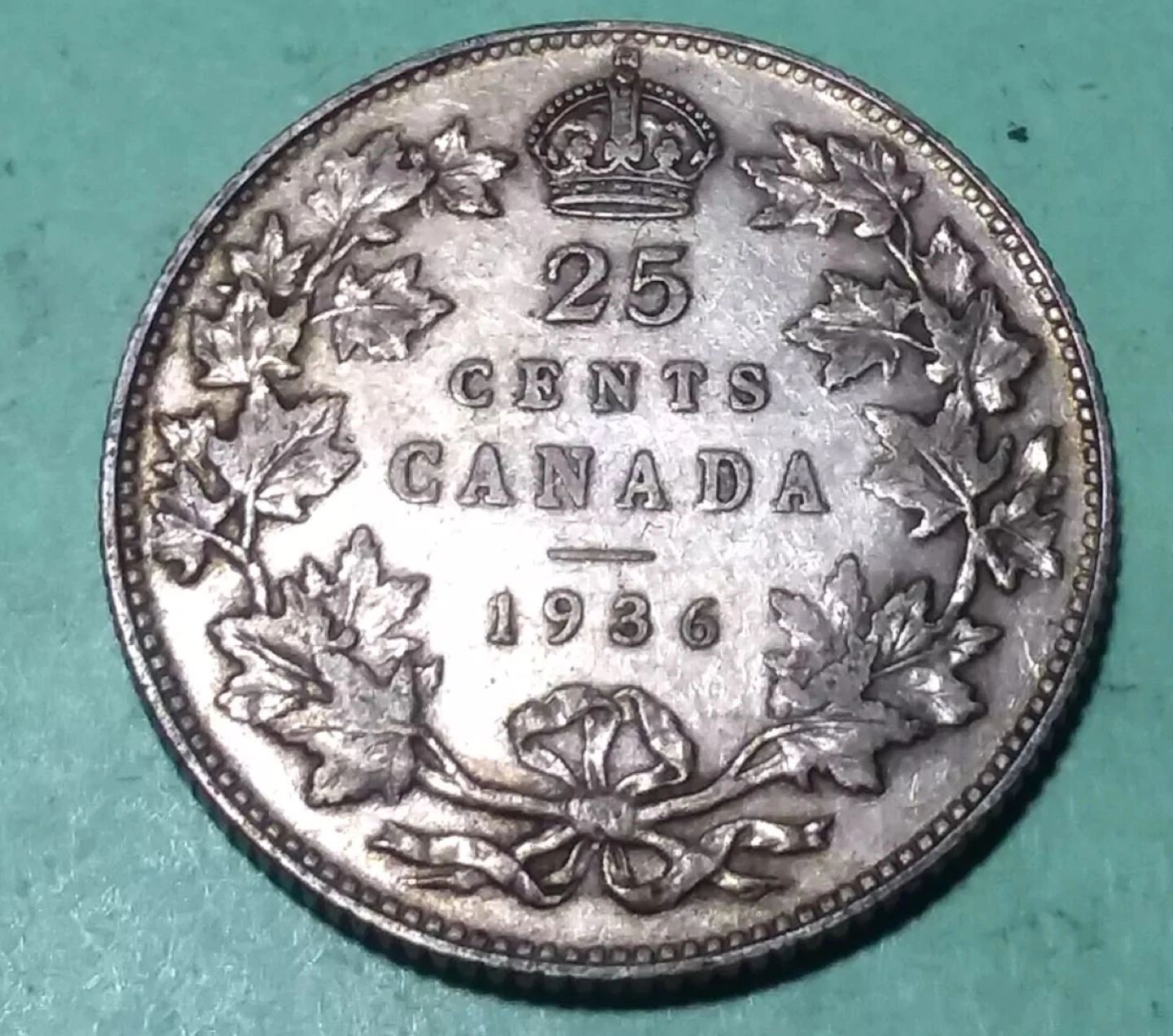 Vintage Canadian quarter. Silver coin. George V. Shows some wear.