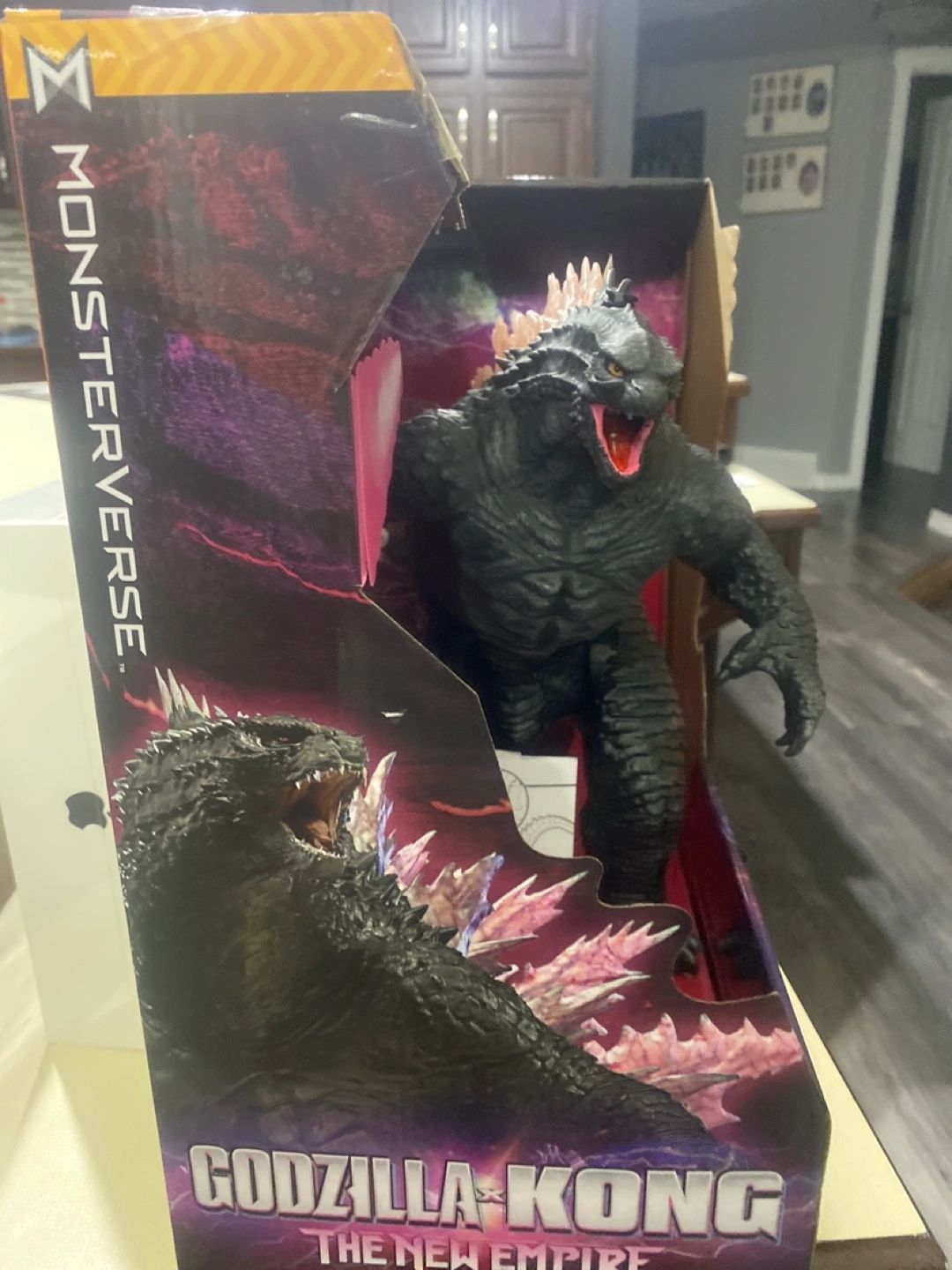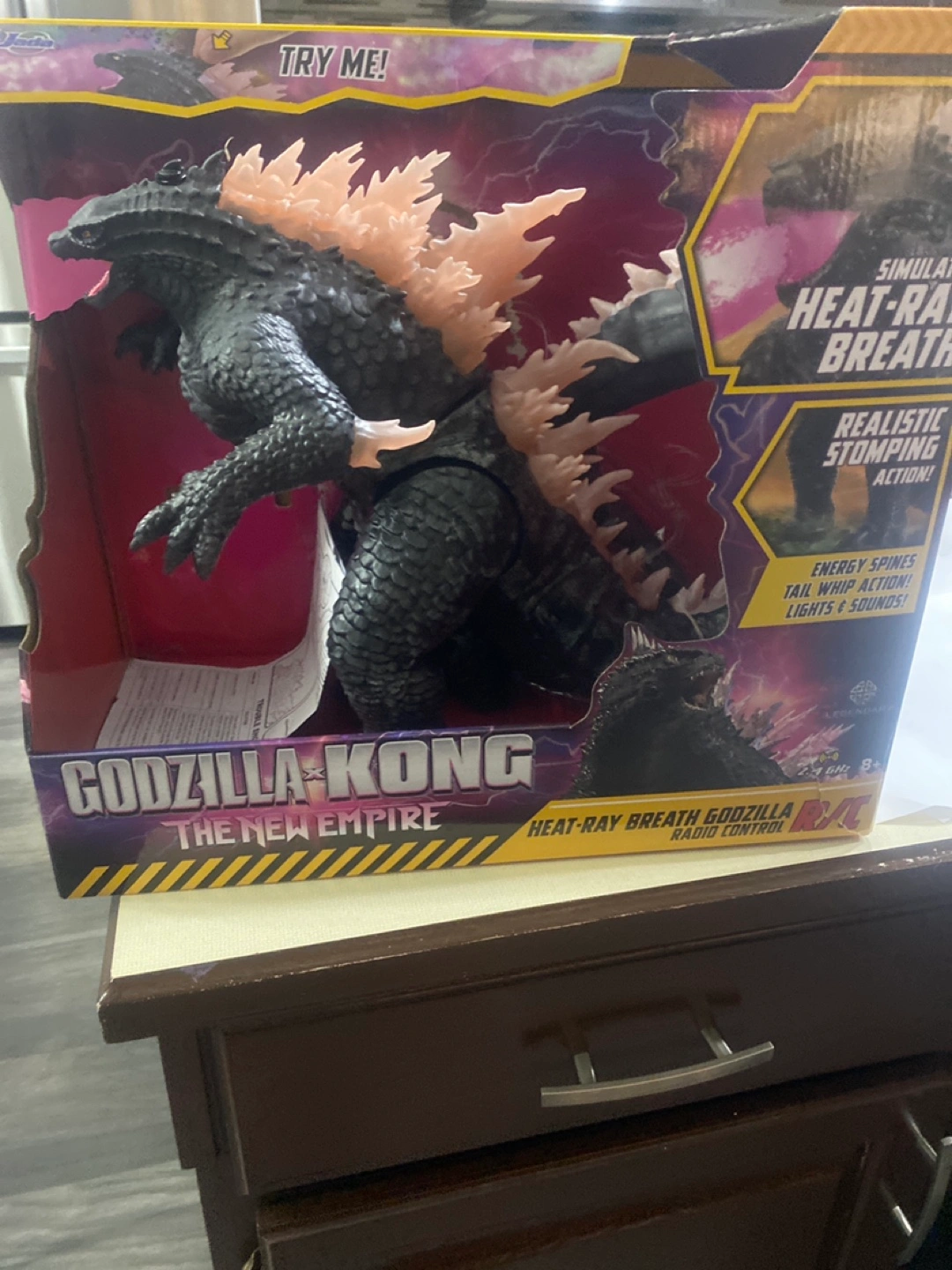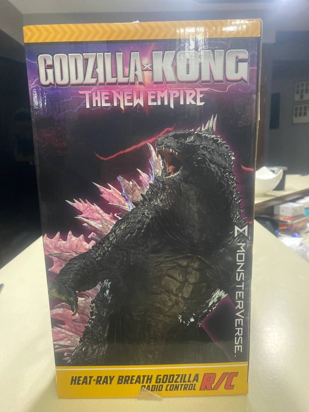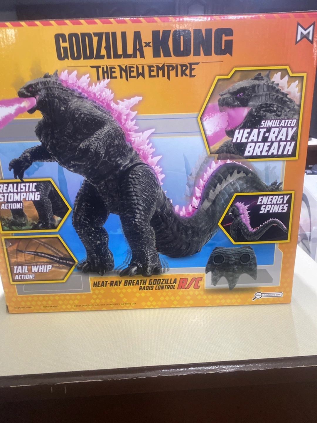 Radio controlled Godzilla toy. Features simulated heat ray breath, realistic stomping action, tail whip action, and energy spines. From Godzilla vs Kong: The New Empire. New in box.