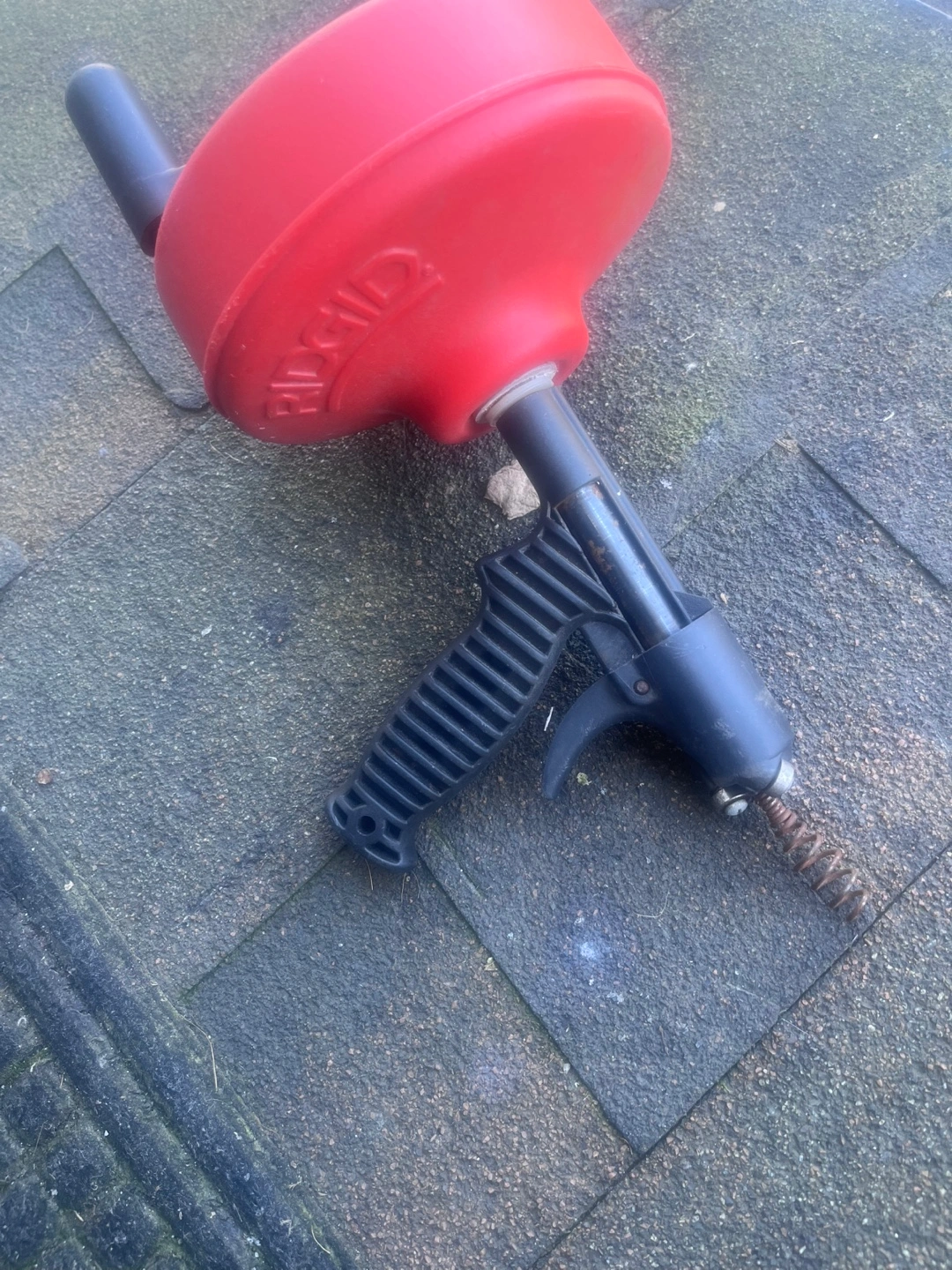 Used RIDGID drain auger. Features a red plastic head and black handle. Includes a spring-type auger.