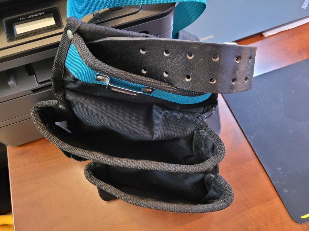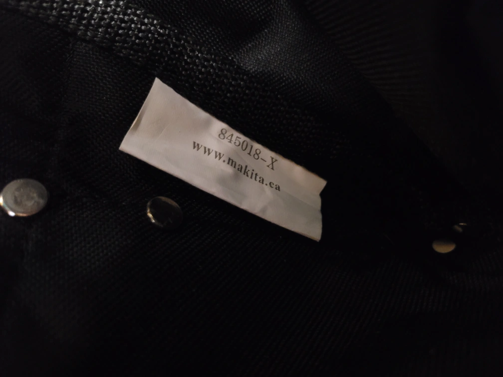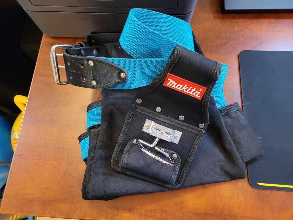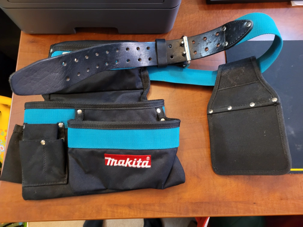 Black tool belt. Multiple pockets and pouches. Leather belt included. Model number 845018-X. Makita's heavy-duty tool belt is a leather double pinned adjustable belt. It has big pouches with multiple pockets, which can be adjusted for position and a D ring holster made for a hammer. Padded belt for extra comfort and support Framer's pouches include tape measure clip, general purpose pockets, and specially designed pockets. Top grain leather hammer holder keeps the handle away from the user.