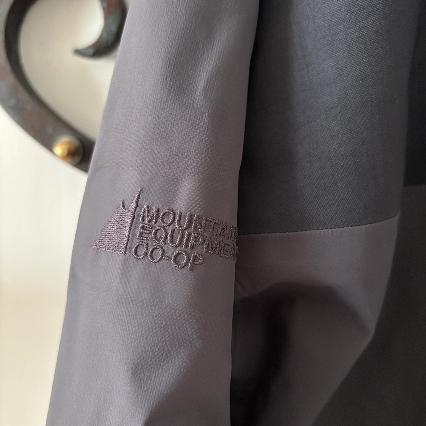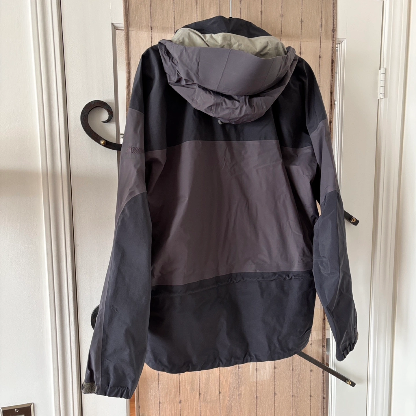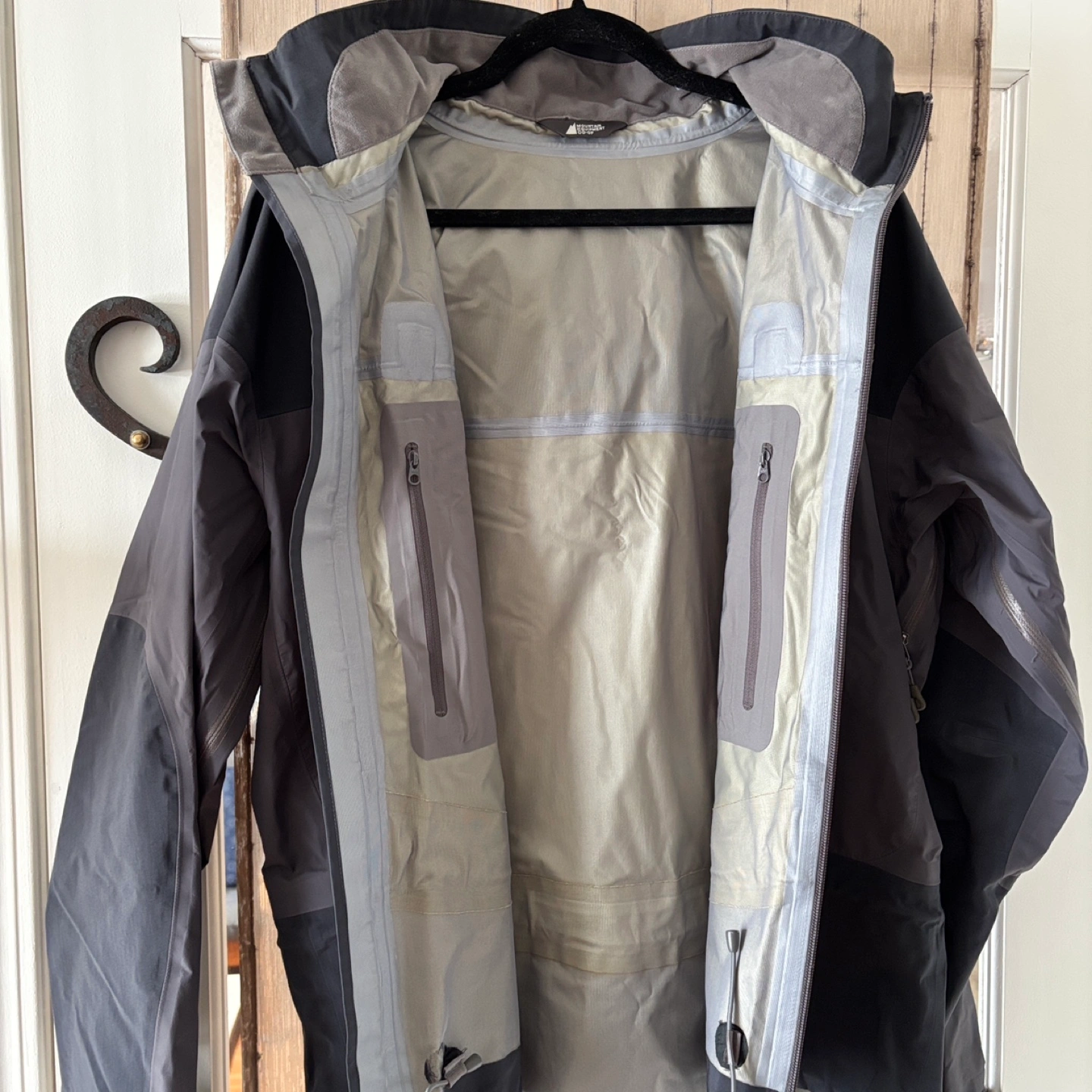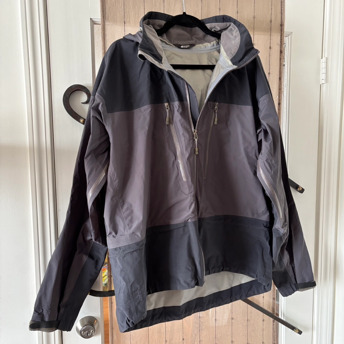 Men's waterproof jacket. Two-tone grey colour scheme. Features a hood and multiple pockets. Excellent for outdoor activities. Used with lots of life left. Better made than my Arc’teryx / arcteryx. Selling for about 90% off. Fits L.