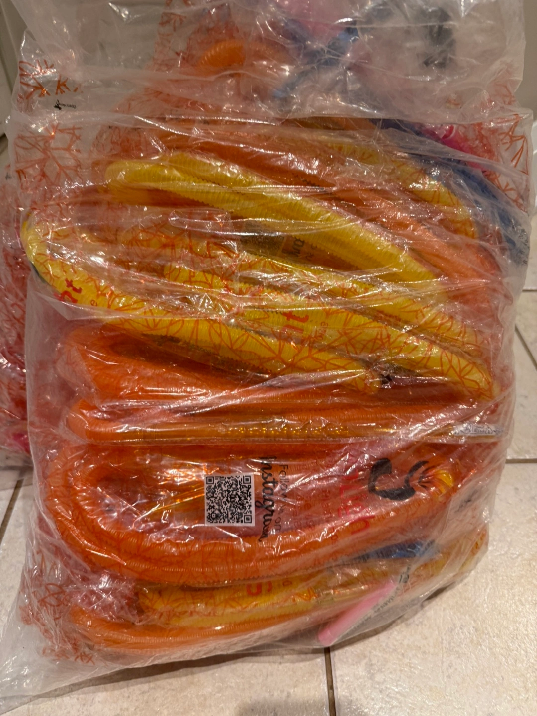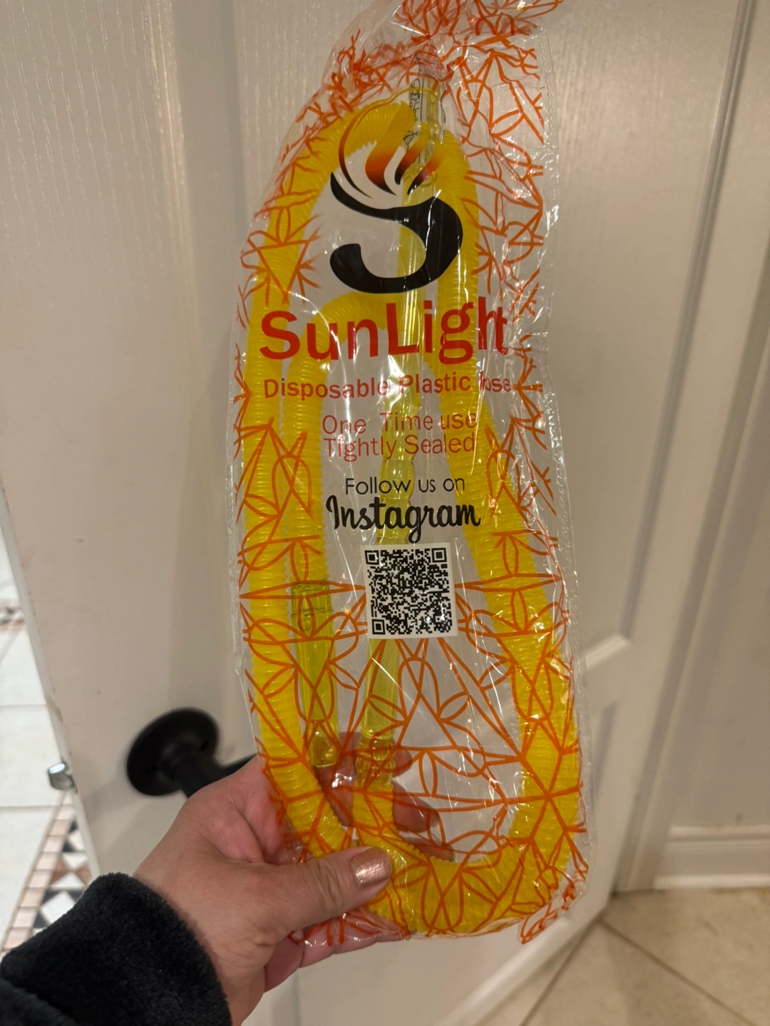 Multiple packages of Sunlight brand disposable plastic hoses. One-time use, tightly sealed. Orange and yellow colours. Bulk purchase. $5 each