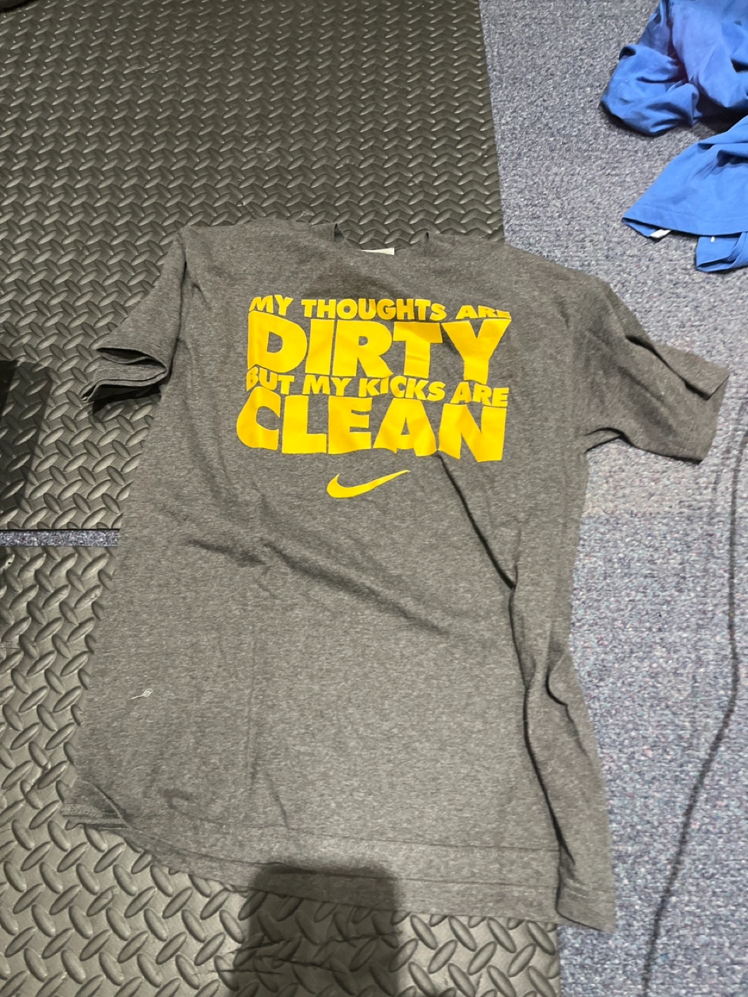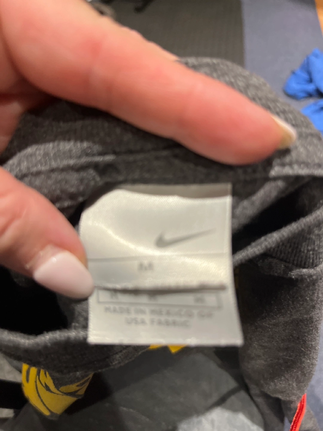 Grey Nike t-shirt. Features a gold graphic. Size medium. Made in Mexico, USA fabric. Classic Nike great condition worn ones make me an offer cash only please
