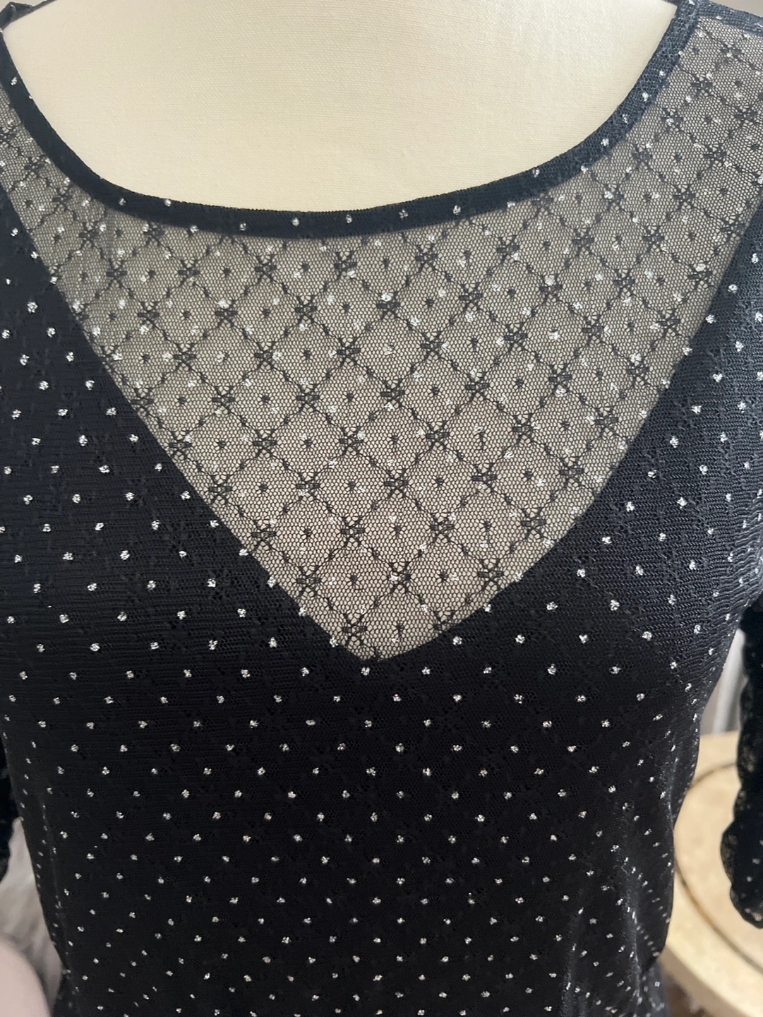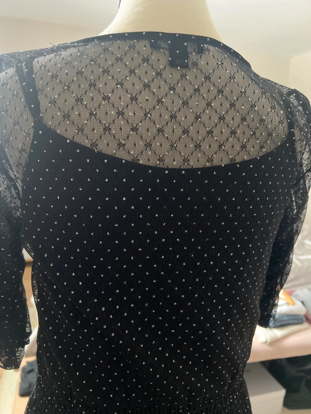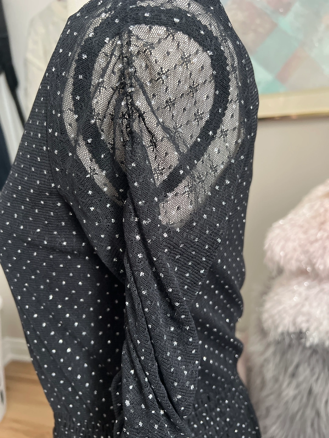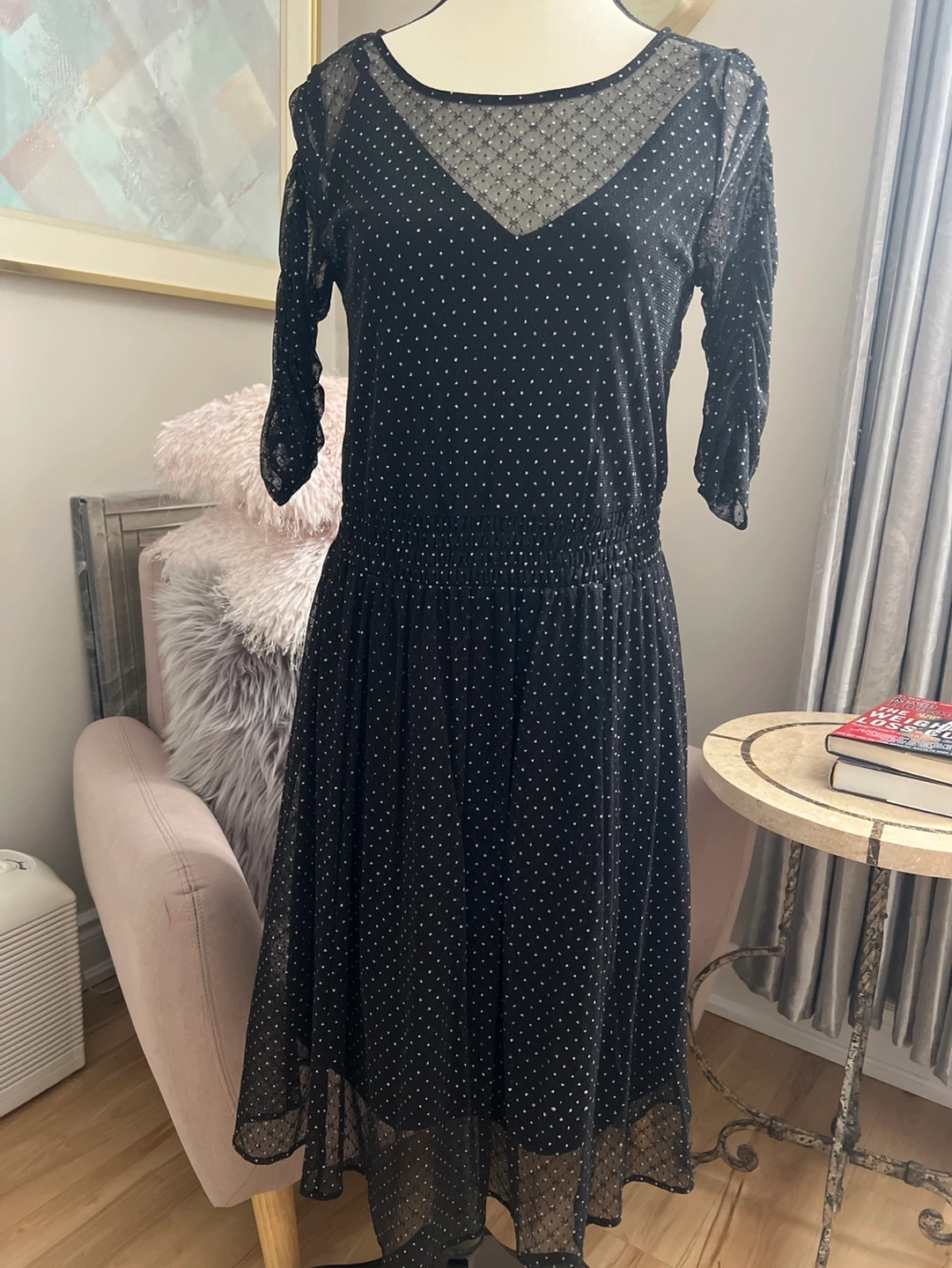 Elegant black midi dress. Features a sheer lace overlay at the neckline and shoulders. Three-quarter sleeves. Silver glitter polka dot pattern. Size Medium.