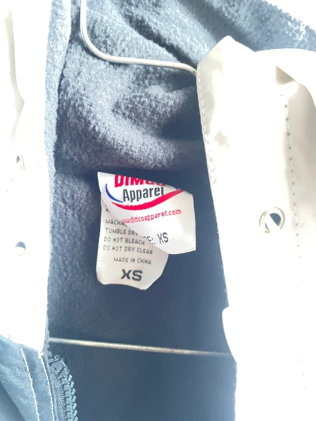 White and black windbreaker. Features a drawstring waist and hood. Juneau Alaska embroidery on the front. XSmall size.