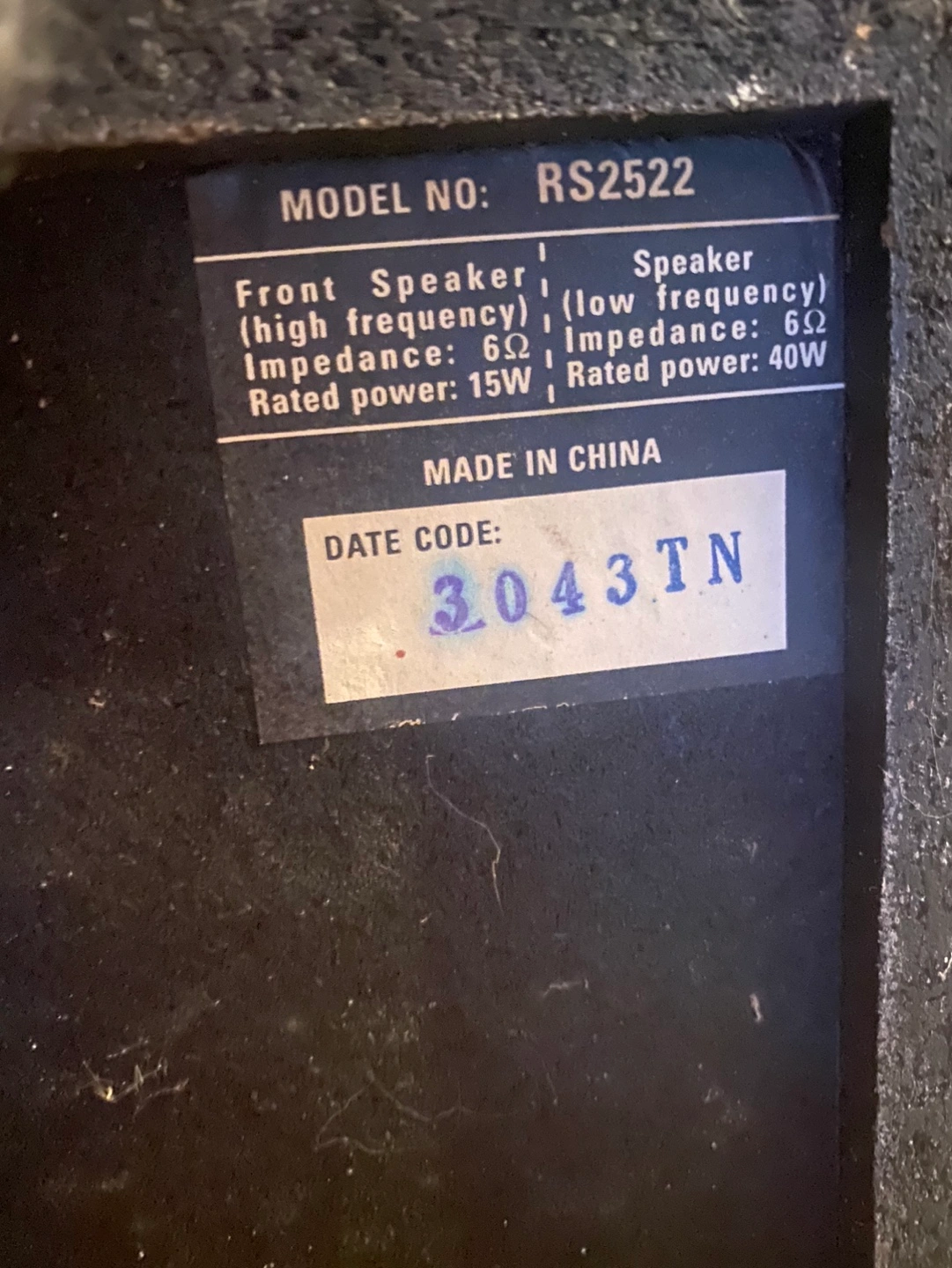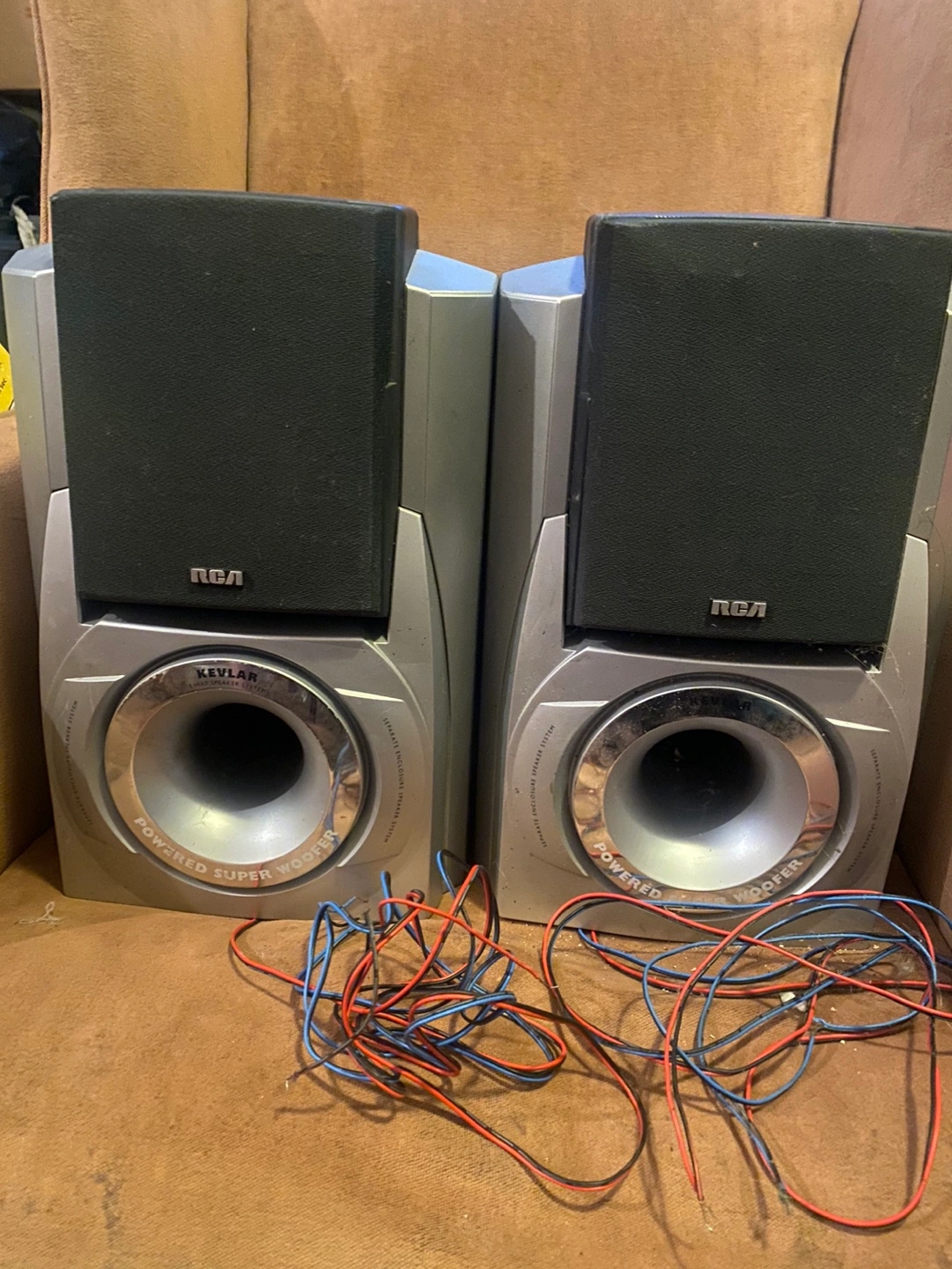 Pair of RCA RS2522 powered speakers. Includes speaker wire. Model number RS2522. Kevlar woofers. Good condition. Model number RS2522. Made in China. 40W rated power. Worked great last used been sitting in storage no longer needed as they were used with my sound system I upgraded the speakers on. Would be perfect for any sound system. Looking to sell them as is where is. Located in Monck Ontario 15 minutes away from Arthur Ontario.