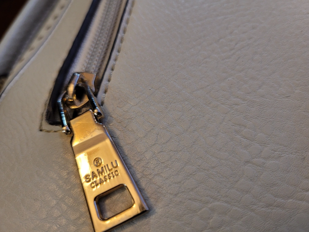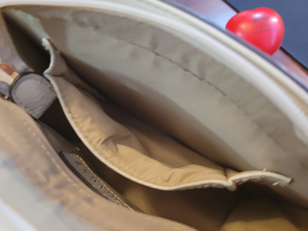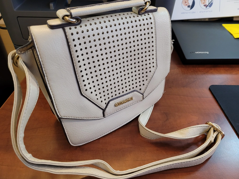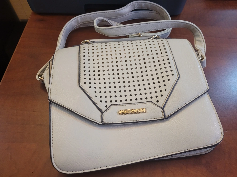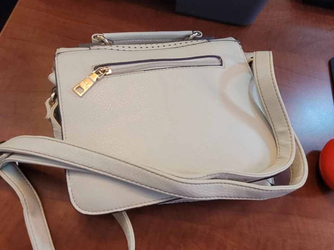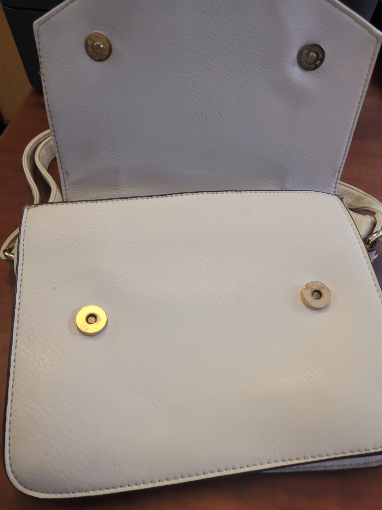 ivory crossbody bag. Features a flap closure with magnetic snaps, adjustable shoulder strap, and zip pocket. Interior features a small zip pocket. Stylish and compact. minimal signs of wear evening purse, day bag