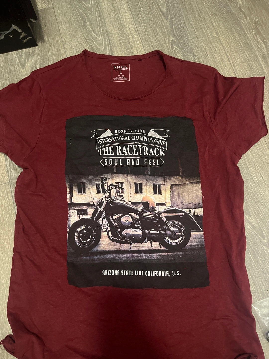 Maroon t-shirt, large size. Features a graphic print of a motorcycle with text. Slightly distressed look.