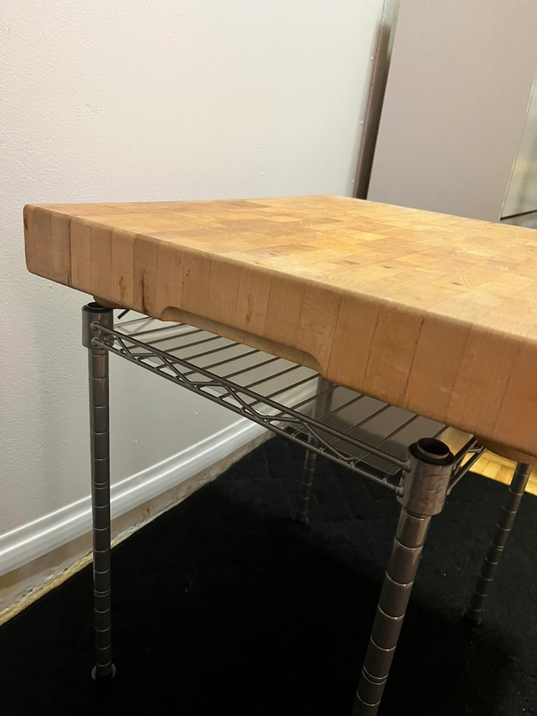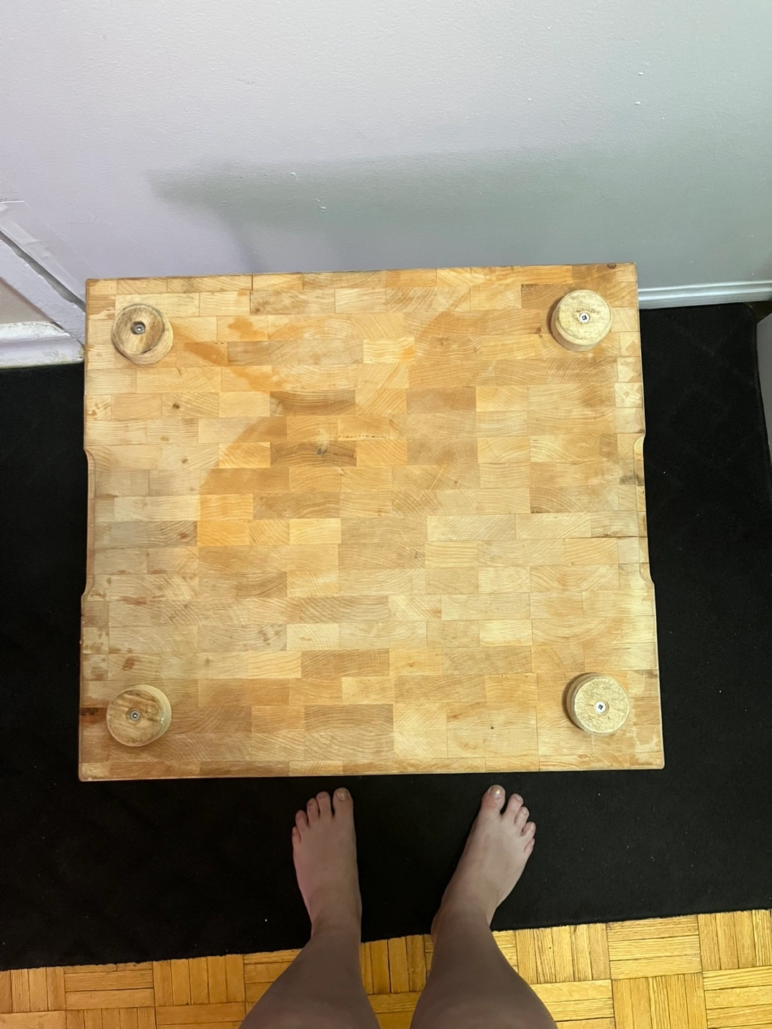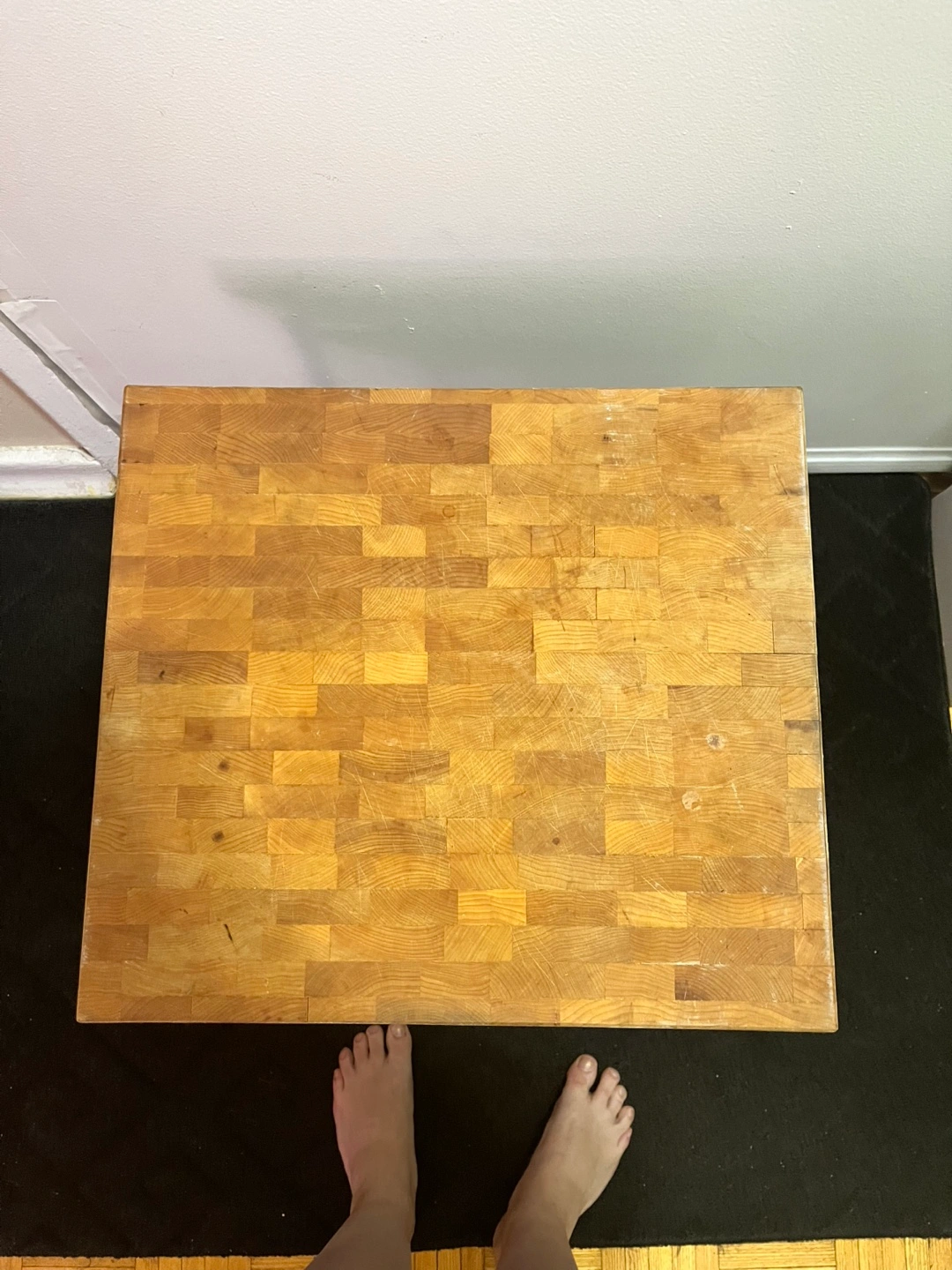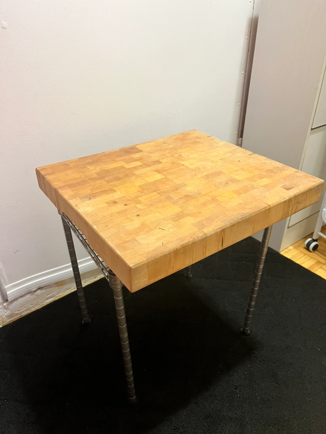 Large butcher block top (not the wire shelf it’s sitting on). Used for vegetables, fruit, bread. Not meat. Needs a good sand down and some refinishing but has plenty of life left. Heavy. 16 in / 18 in. 2 in thick with wooden feet (just under 1 inch). **PLEASE READ** FOR PICKUP ONLY: near King St West and Jameson Avenue in Parkdale. My exact address is only given for confirmed pickups.