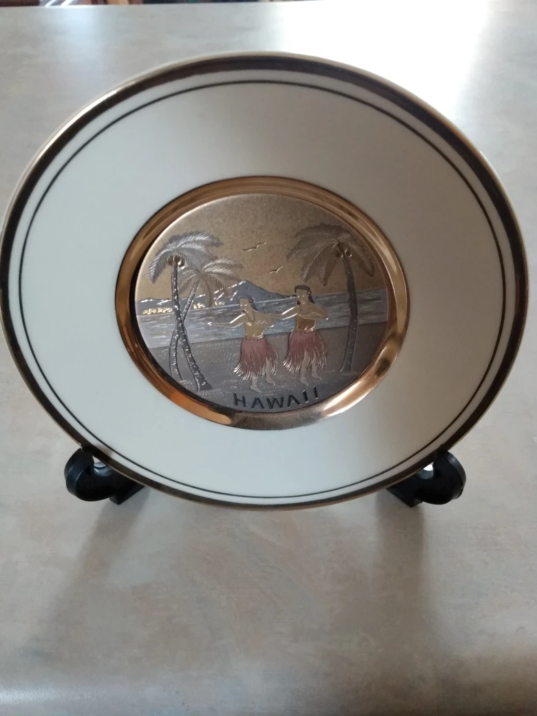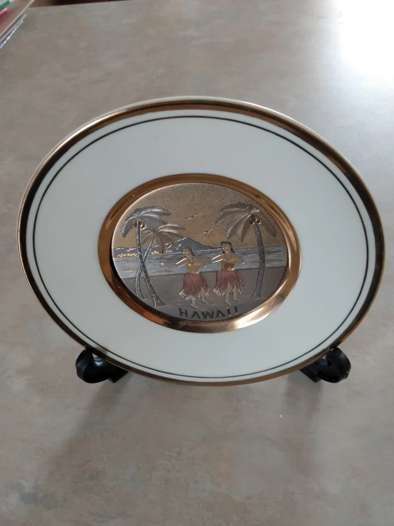 Beautiful decorative plate. Features a Hawaiian scene with hula dancers. Gold accents. Includes stand. Collectible item. (Pick up only)