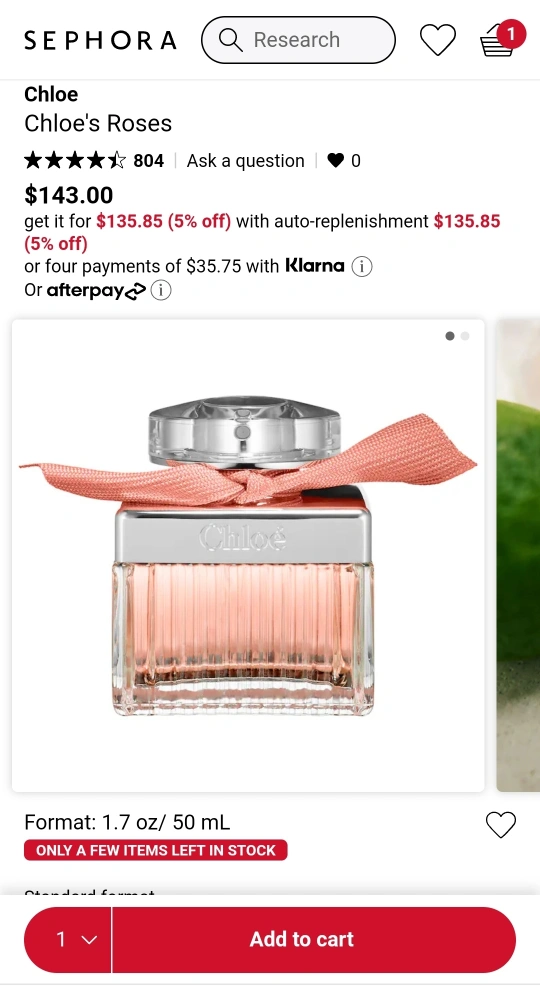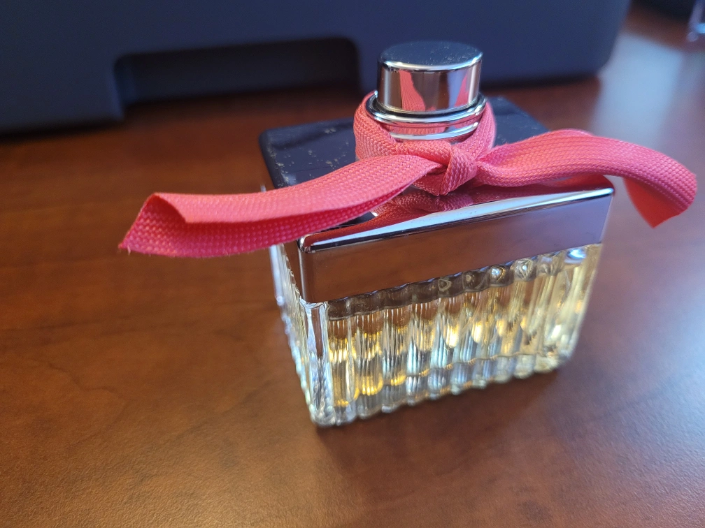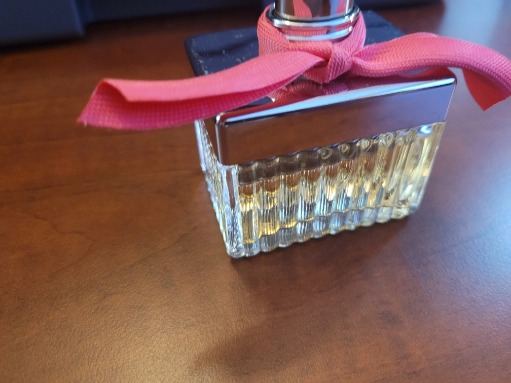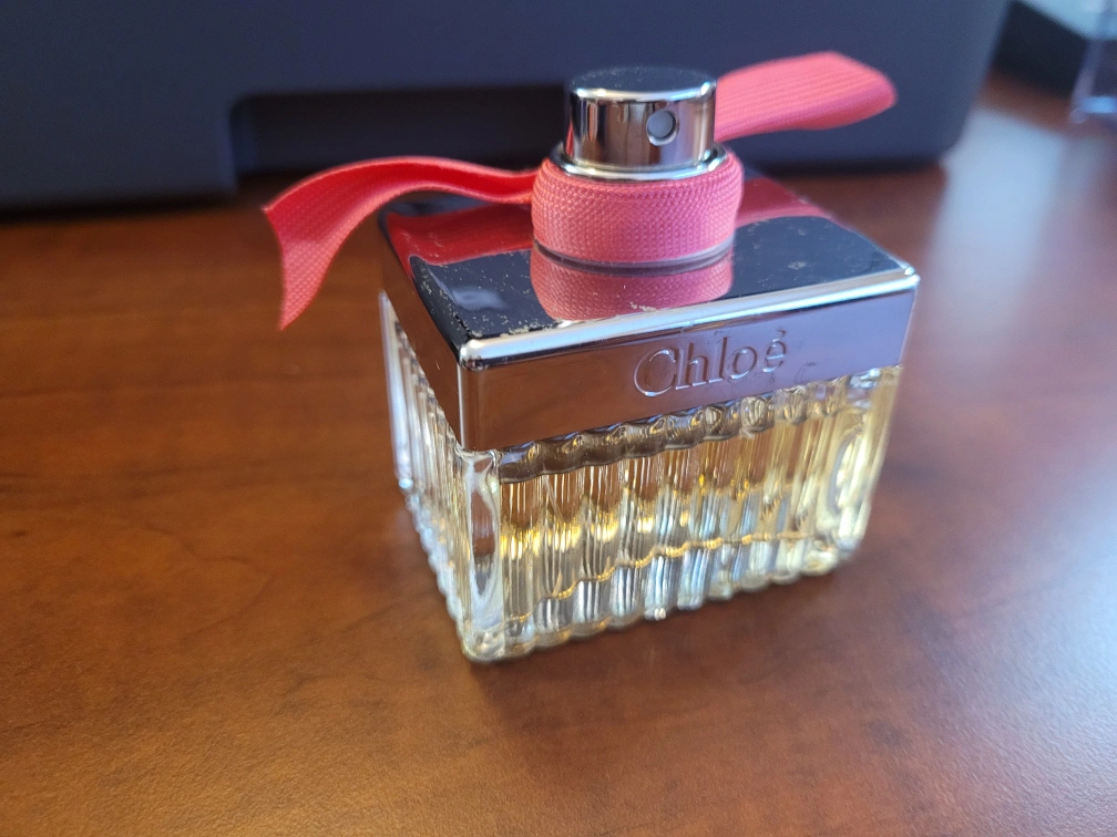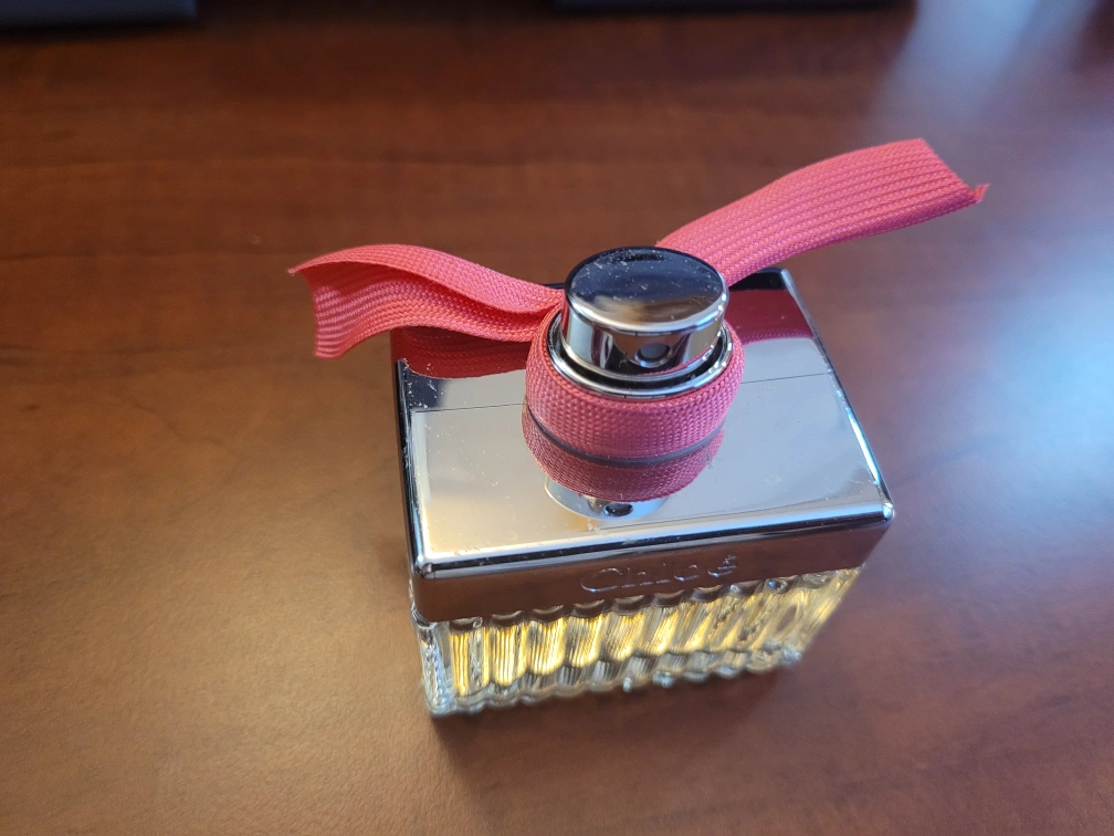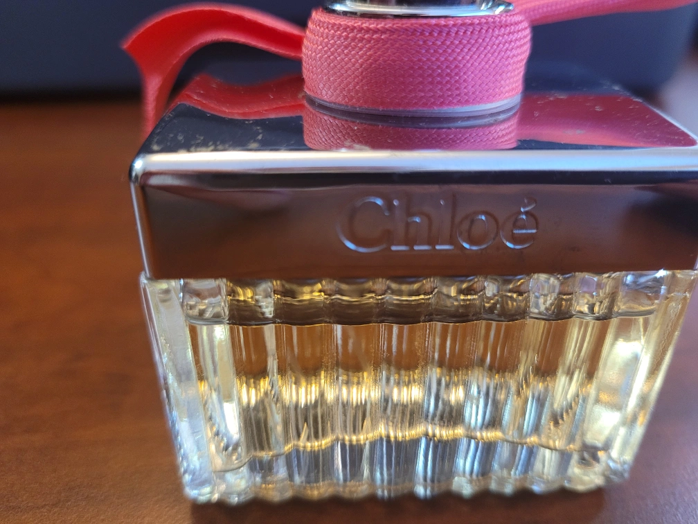 medium bottle of CHLOE EAU DE PARFUM. Features a pink ribbon. Clear glass bottle with silver accents. A little bit used. 50ml bottle $150 at Sephora