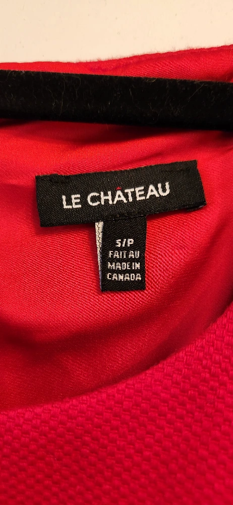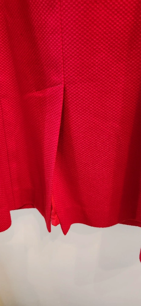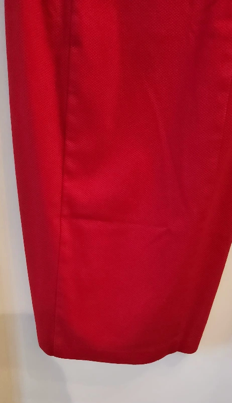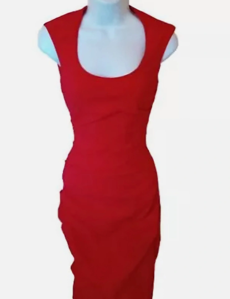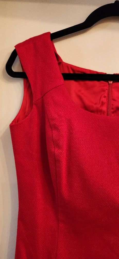 Stunning red pencil dress. Sleeveless, form-fitting silhouette. Classic and elegant style. Perfect for a special occasion. Material is patterned and has a satin lining. Made of 97% cotton and 3% spandex. Made in Canada!