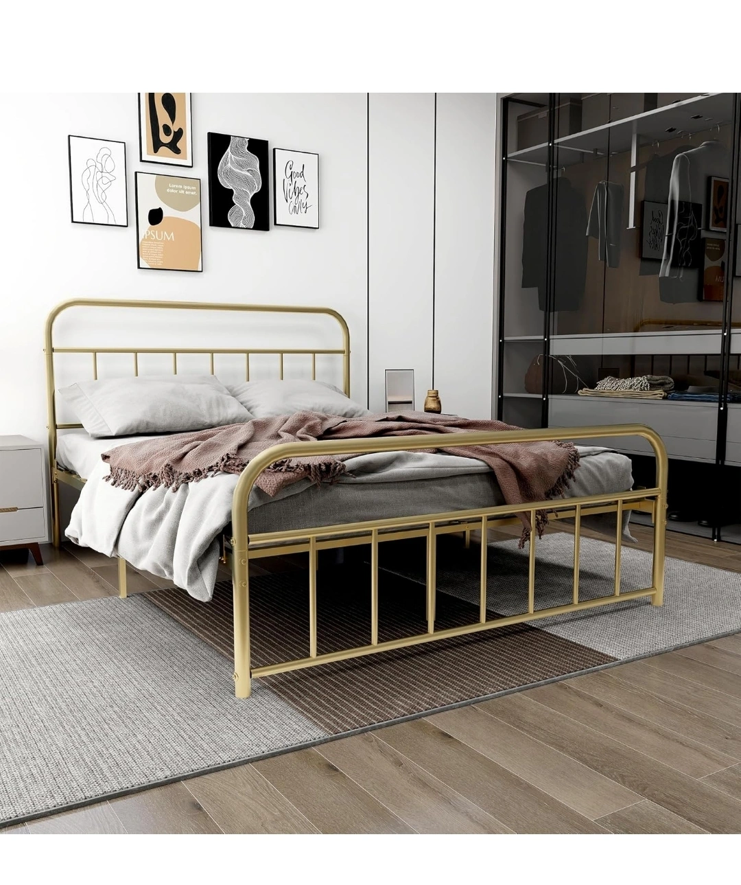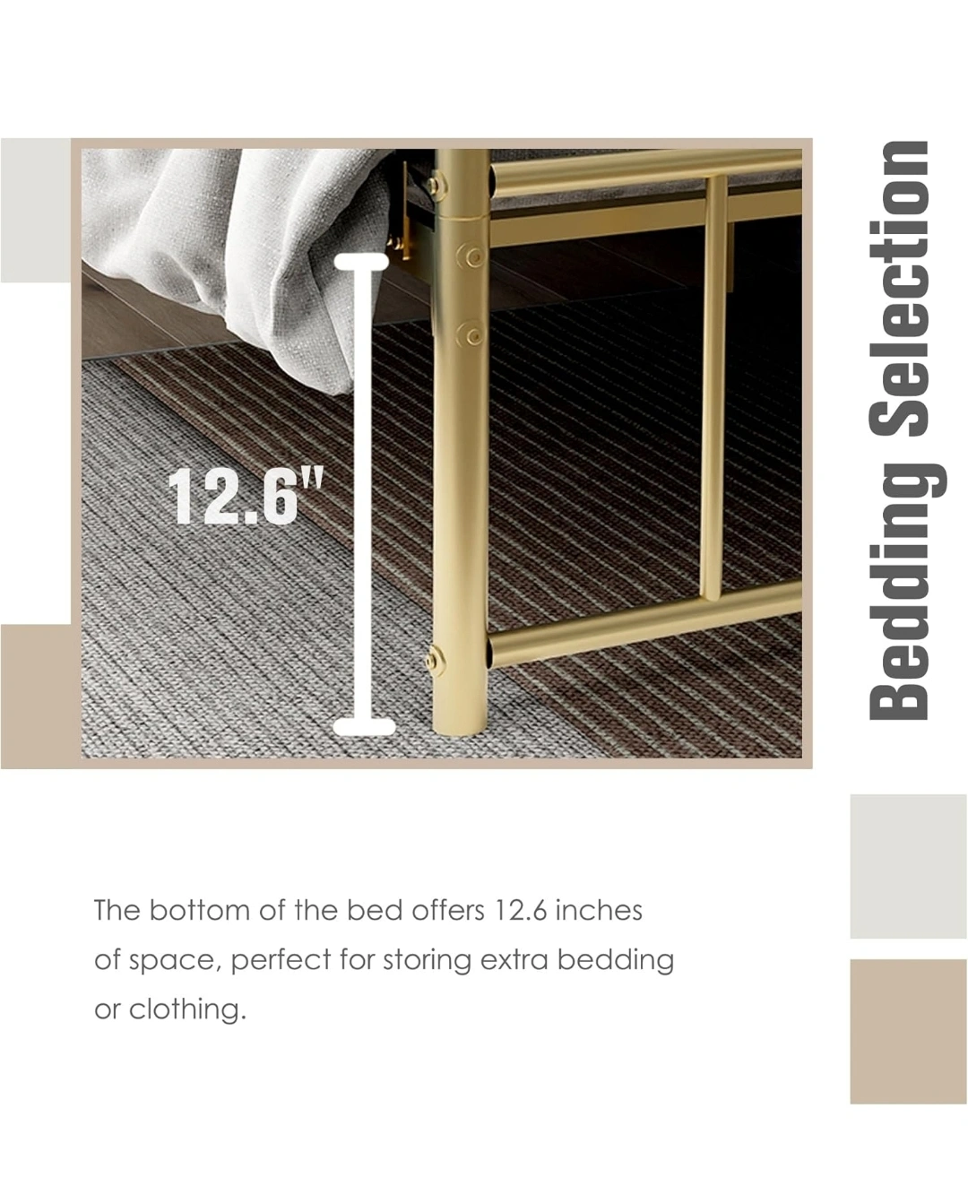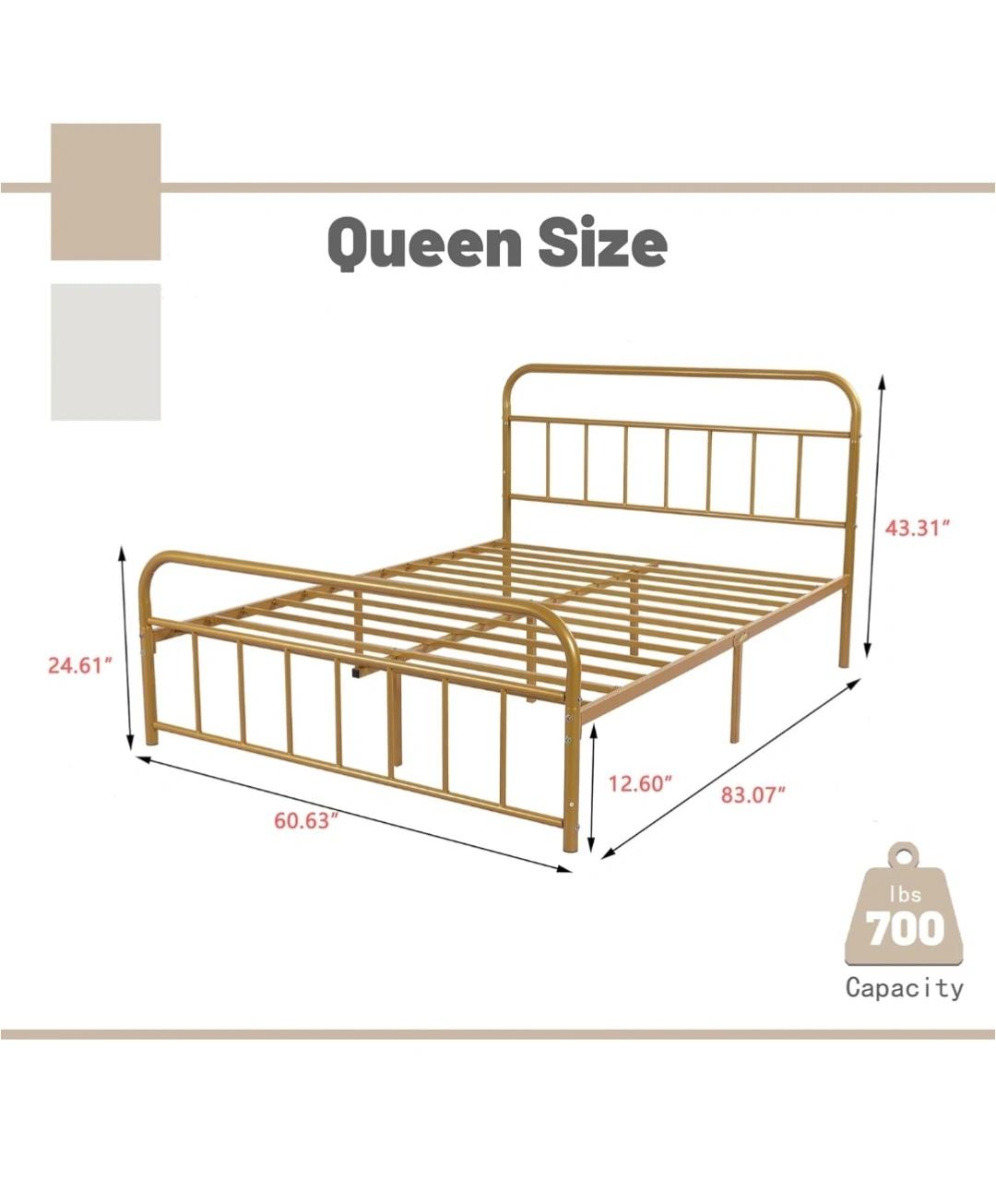Brand New Sealed Queen Metal Platform Bed Frame with Vintage Headboard Footboard Extra Strong Support No Box Spring Needed Noise Free Easy Assembly Gold Stylish queen-size metal bed frame. Gold finish. Minimalist headboard and footboard. 12.6 inches of under-bed storage. 700 lb weight capacity. Recommended 12-inch mattress.