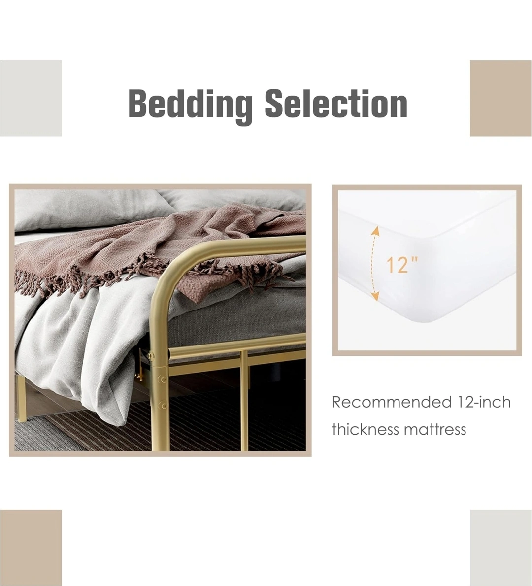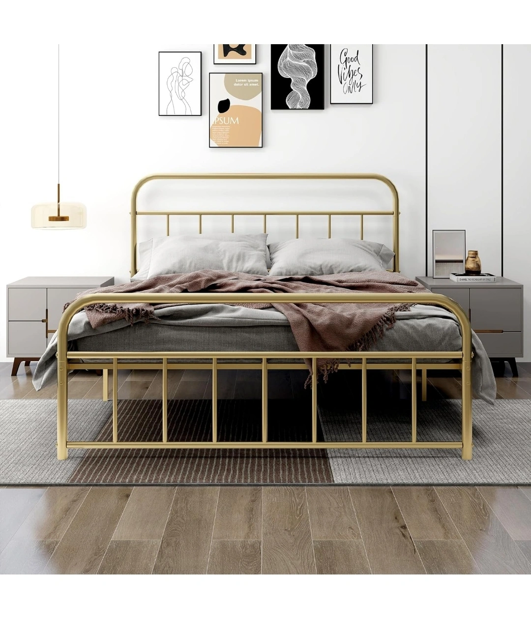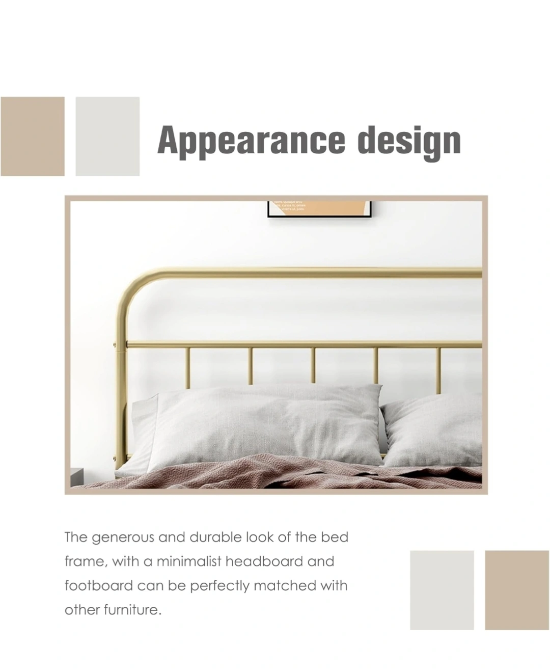 Brand New Sealed Queen Metal Platform Bed Frame with Vintage Headboard Footboard Extra Strong Support No Box Spring Needed Noise Free Easy Assembly Gold Stylish queen-size metal bed frame. Gold finish. Minimalist headboard and footboard. 12.6 inches of under-bed storage. 700 lb weight capacity. Recommended 12-inch mattress.