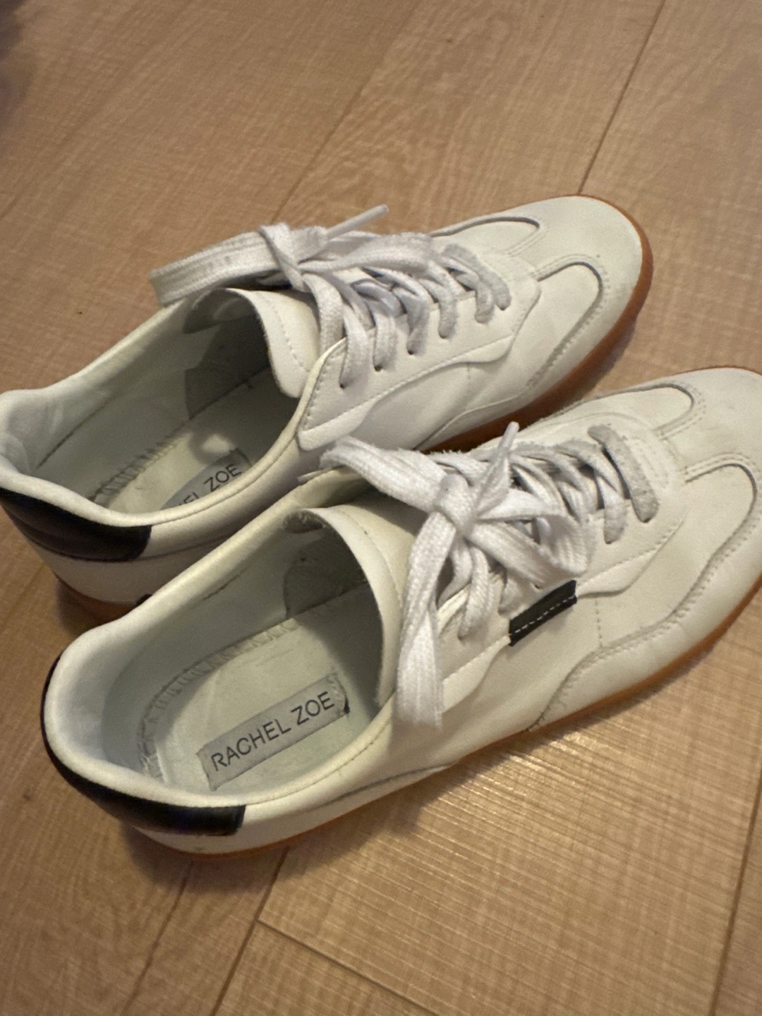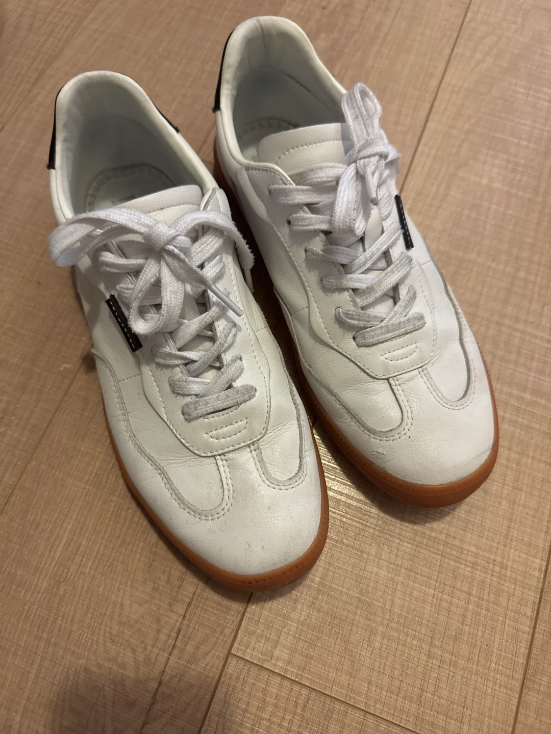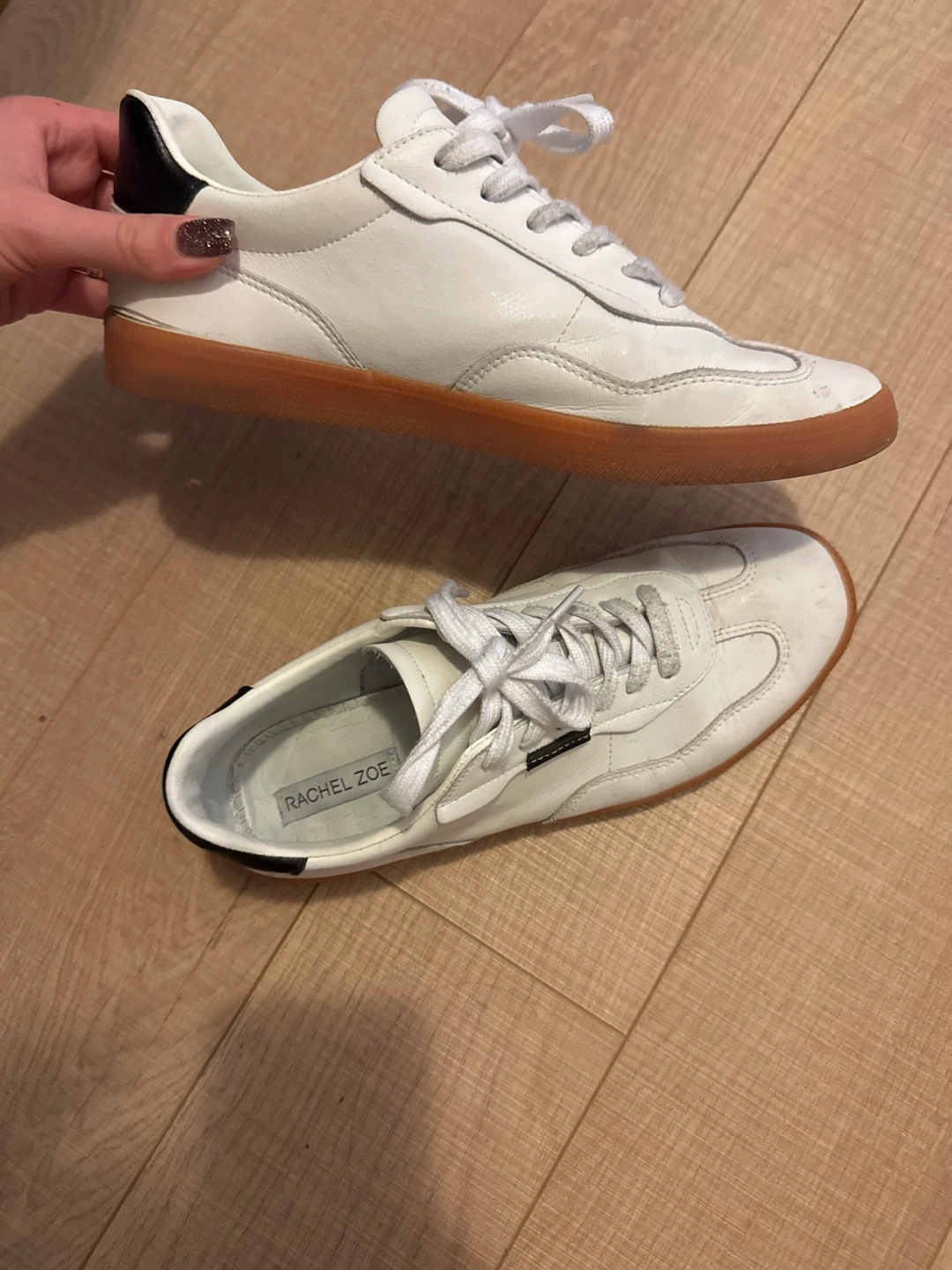 Women's white leather sneakers. Low-top style. Gum sole. Lace-up closure. Size 10