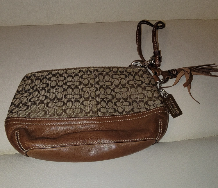 Brown leather and signature C monogram canvas wristlet. Features a wrist strap and leather tassel. Zip closure. 7x5 inches