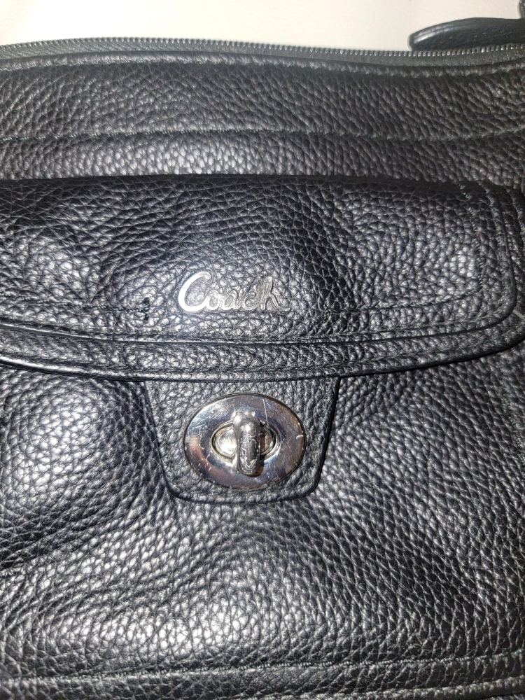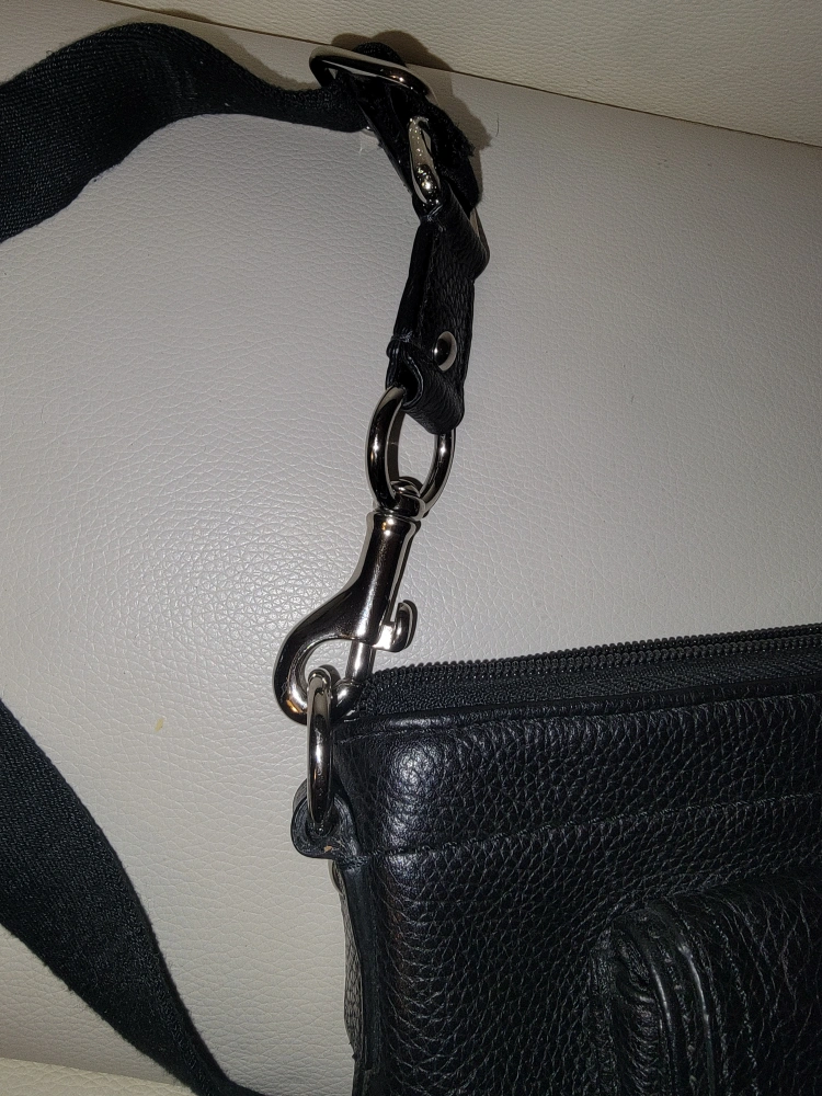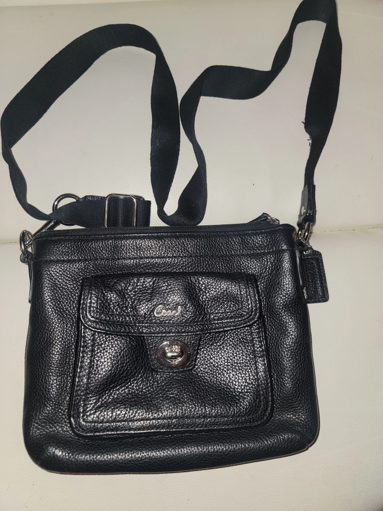 Black leather crossbody bag. Features a front pocket and adjustable strap. Zipper closure. Pre-owned.