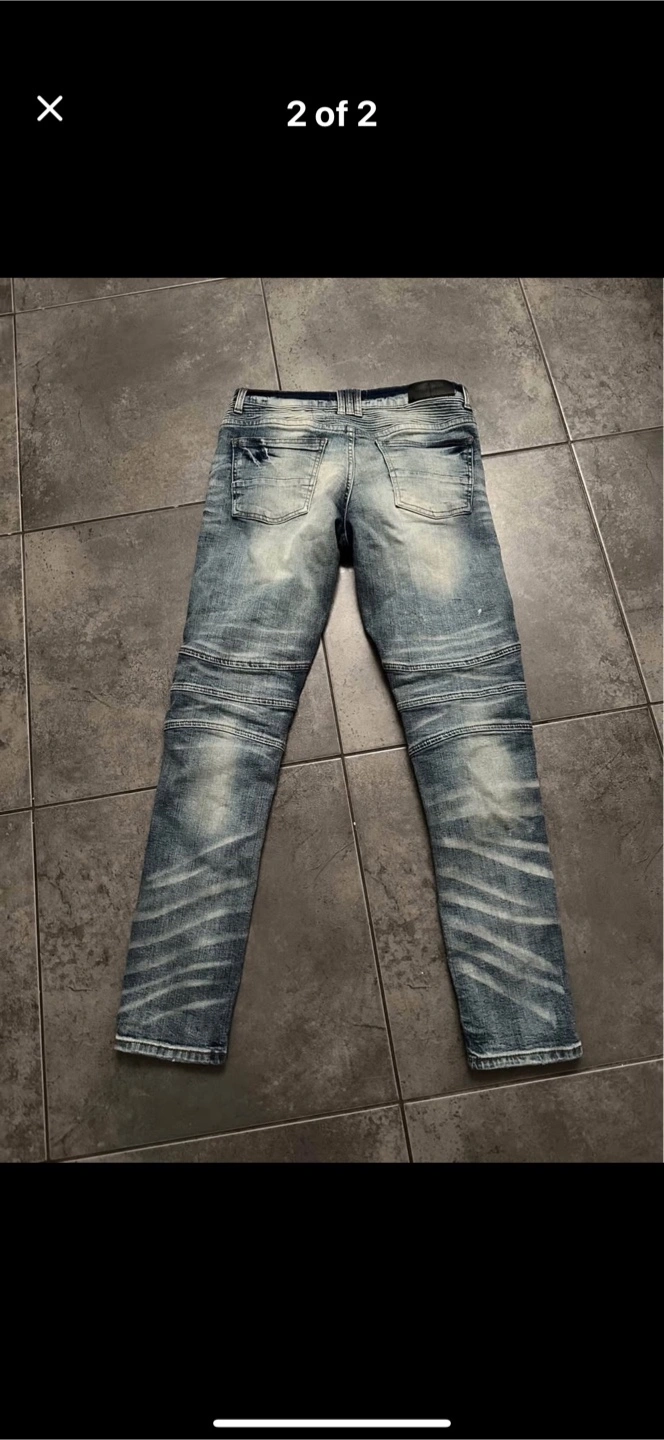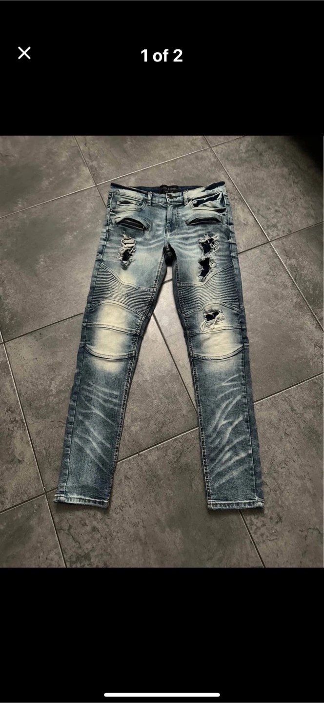 Amiri Style distressed denim jeans. Size medium. Features a biker-style design with multiple panels and rips. Excellent condition