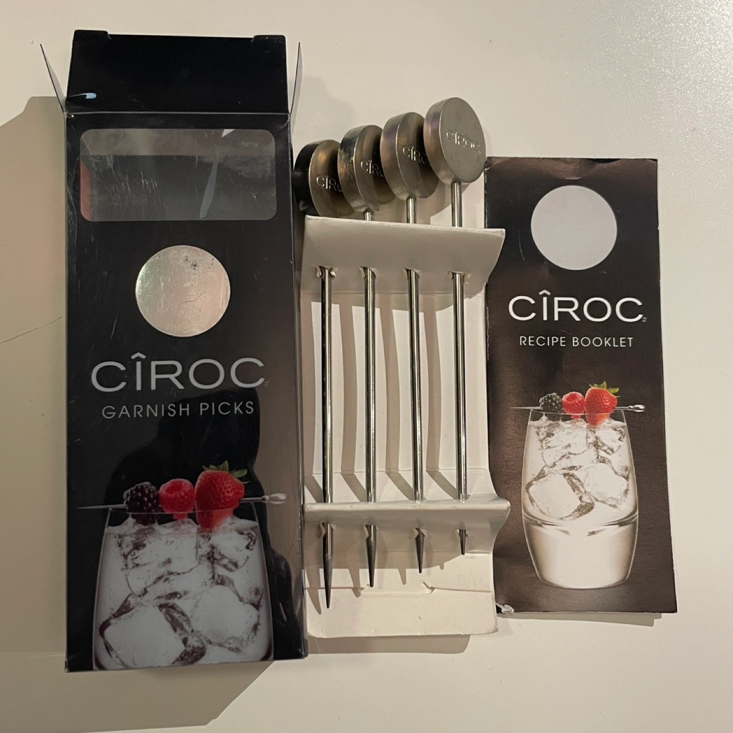 📍 Pick up at 200 Wellesley St E New official CÎROC garnish picks. Set of 4 stainless steel picks for Vodka Cocktails or Martinis. Includes recipe booklet. Total measurement is 4” long with a pick length of 3, 1/4”. CHECK MY OTHER ADS