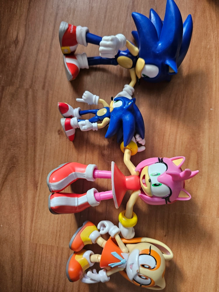 Set of four Sonic the Hedgehog figures. Includes Sonic, a smaller Sonic, Amy Rose, and Cream the Rabbit. Collectible figures, great for fans.
