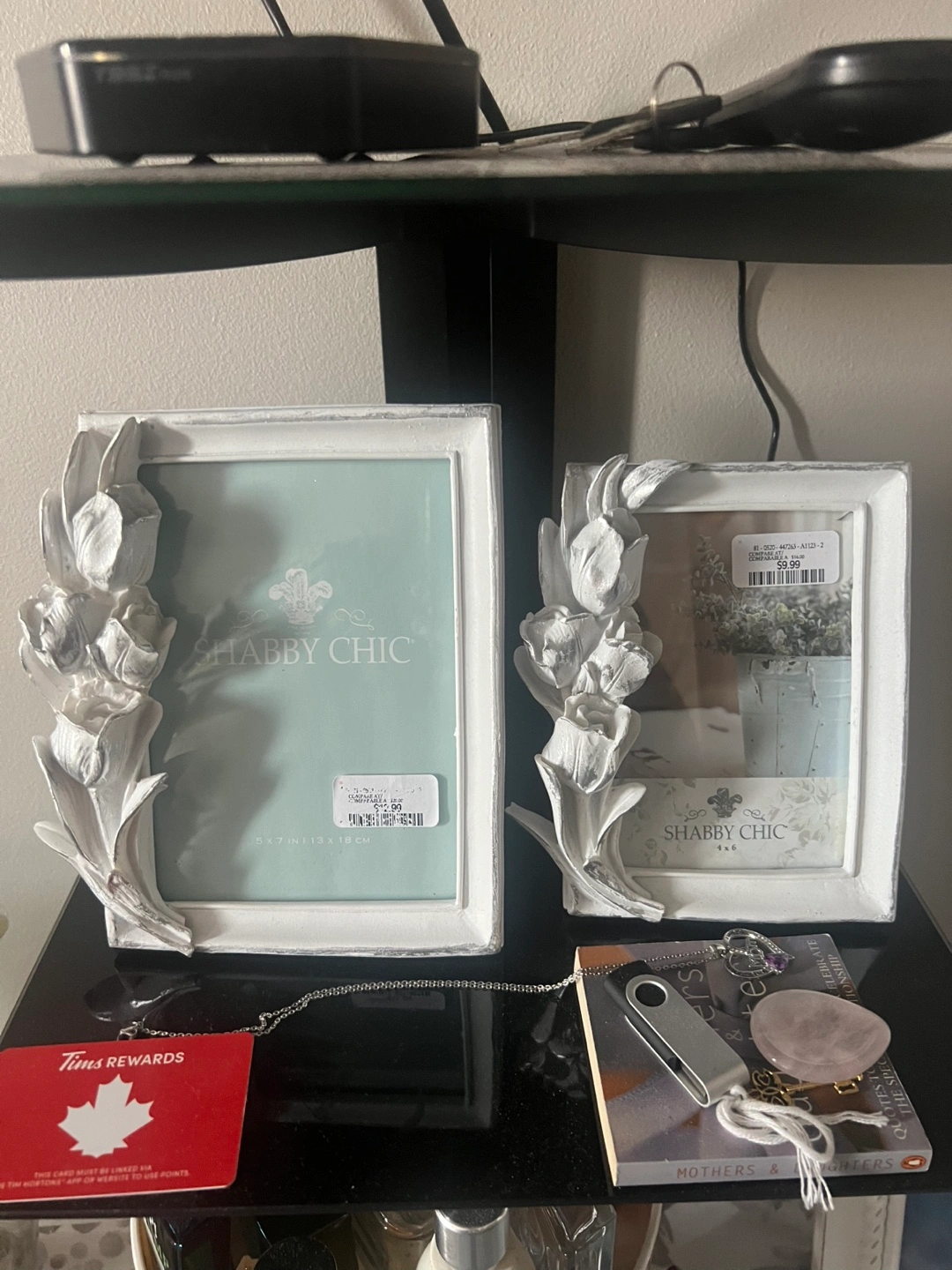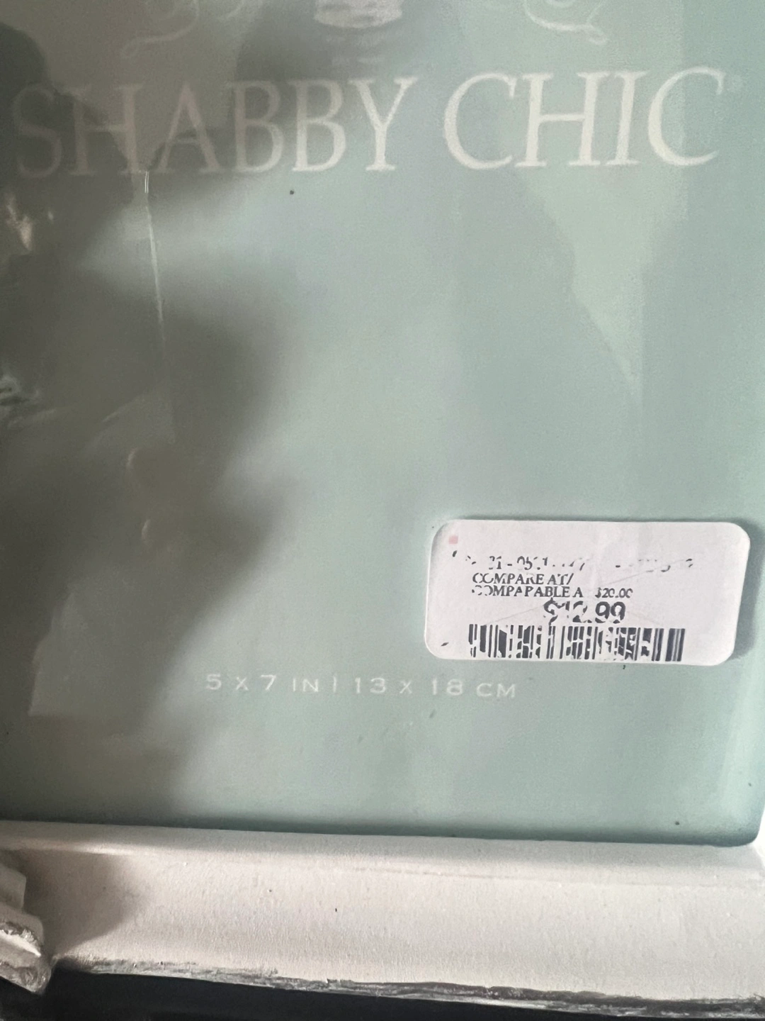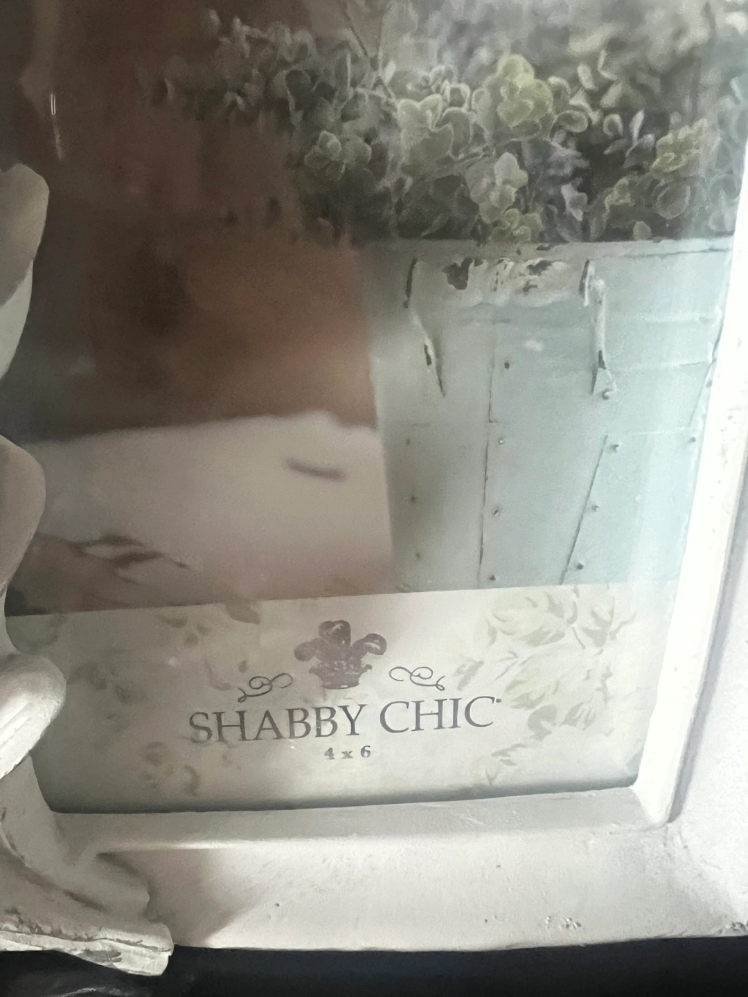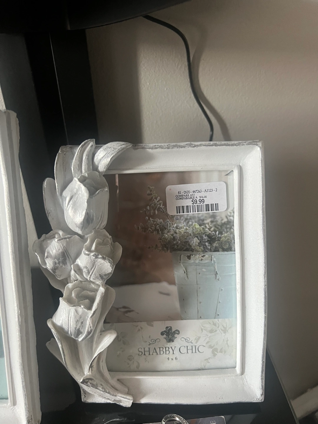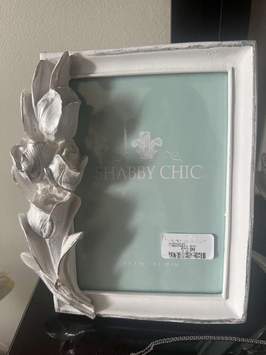 white shabby chic picture frame. Features floral accents. Holds a 5x7 inch photo and 4x6 photo .. Excellent condition. Both for $10