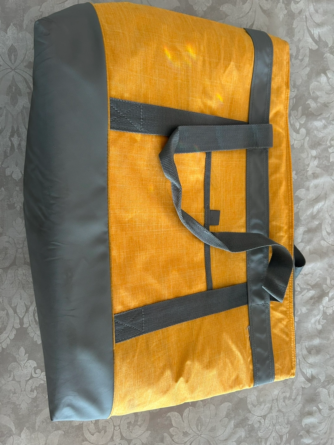 Large capacity insulated tote bag. Features two long shoulder straps and a smaller top handle. Grey accents. Perfect for grocery shopping or picnics.