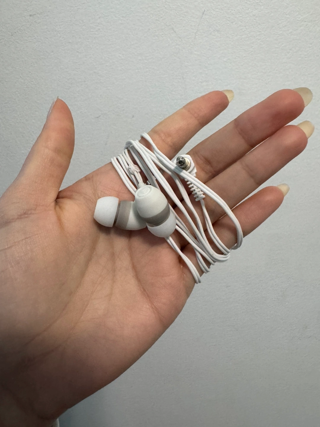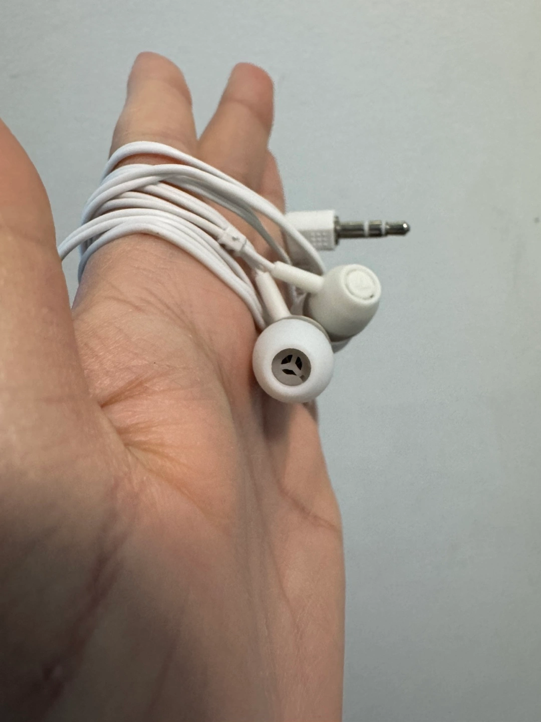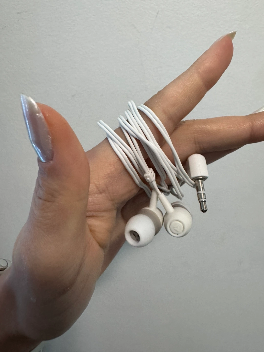 Pair of white wired earbuds. 3.5mm jack. Lightweight and comfortable. Great for everyday use. New, never used as it don't connect with my iPhone 🤣