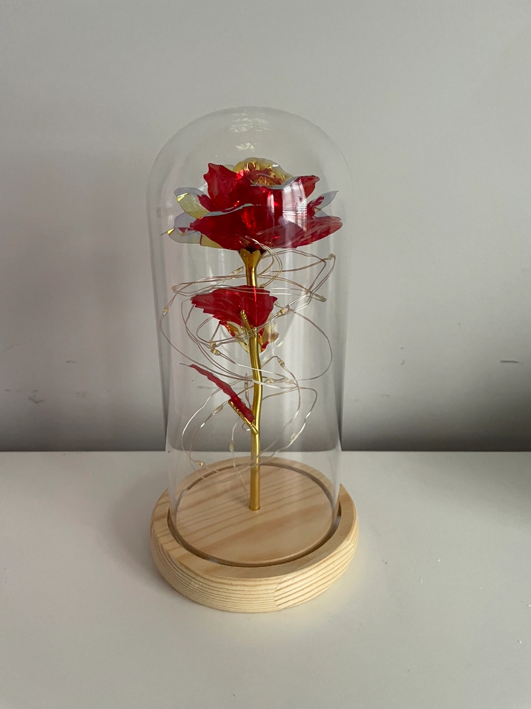 Gorgeous gold-dipped red rose encased in a glass dome. Features LED lights. Wooden base. Perfect gift or home decor.