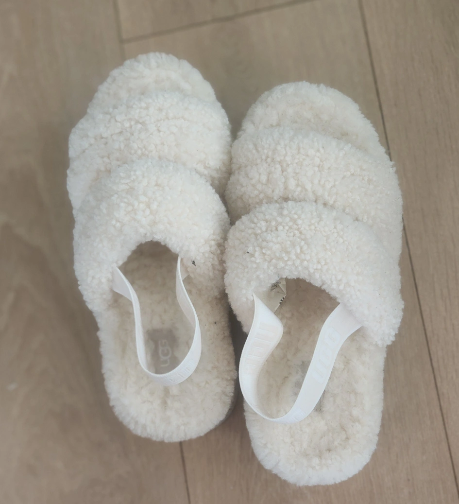Cozy UGG Fluffita Yeah slides. Off-white colour. Double band design. Soft, fluffy interior. Great for lounging. * Cash Only * * No E-transfers * * Serious Offers Only * * Pickup Only *