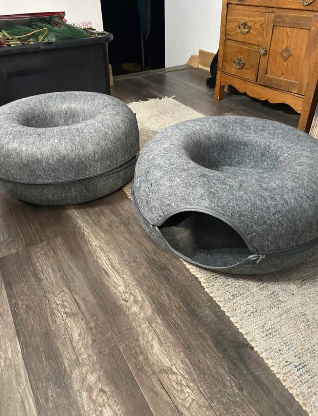 Two large grey donut cat beds. New, never used. Durable and washable. Felt material, scratch resistant. Dark grey. Zippered design. Great for cats up to 30 lbs. 23” diameter across Originally $85 $25 each - have 2 - you can unzip them and zip them together.